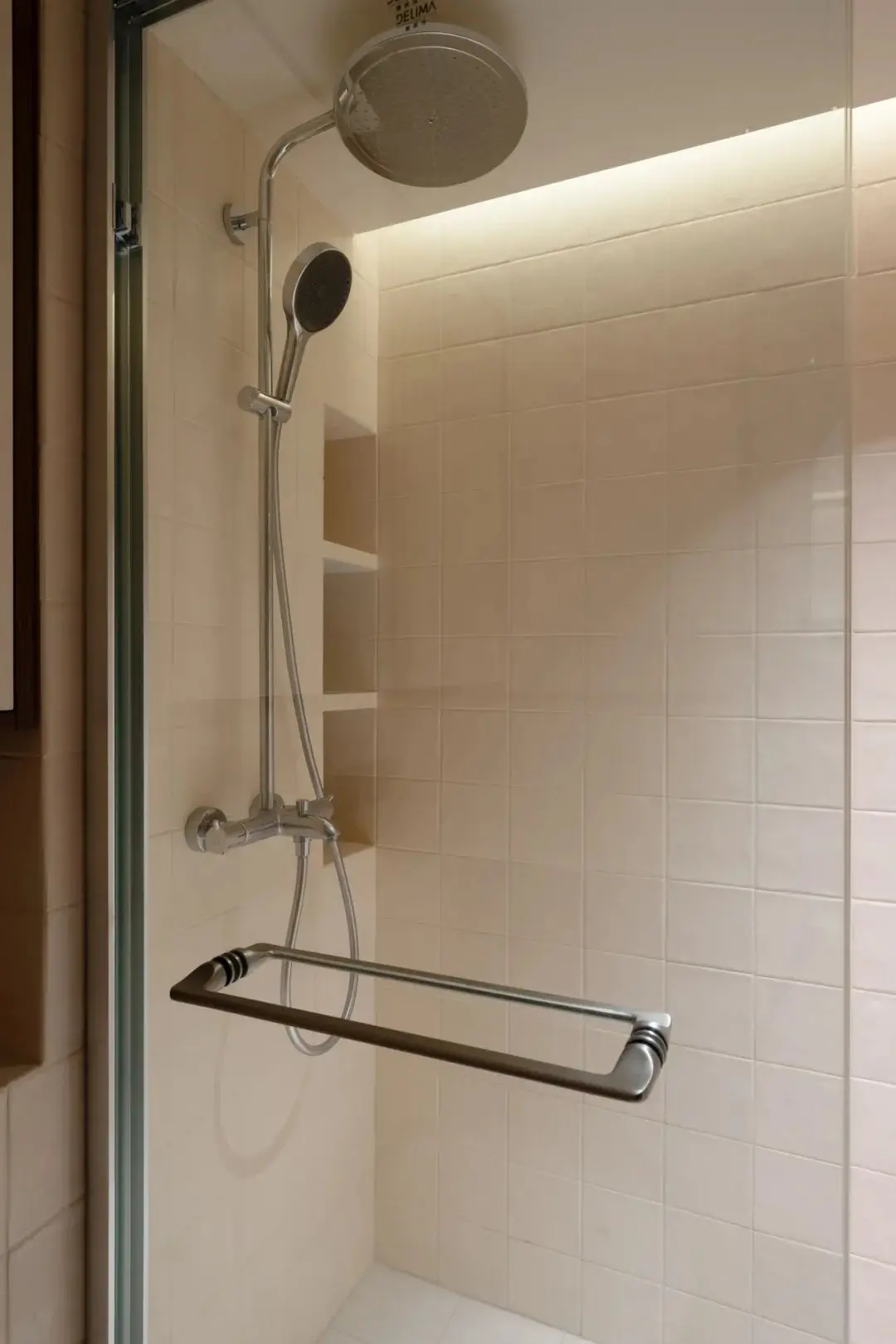 淋浴区以玻璃门隔断,壁龛的设计,刚好放置沐浴清洁用品。