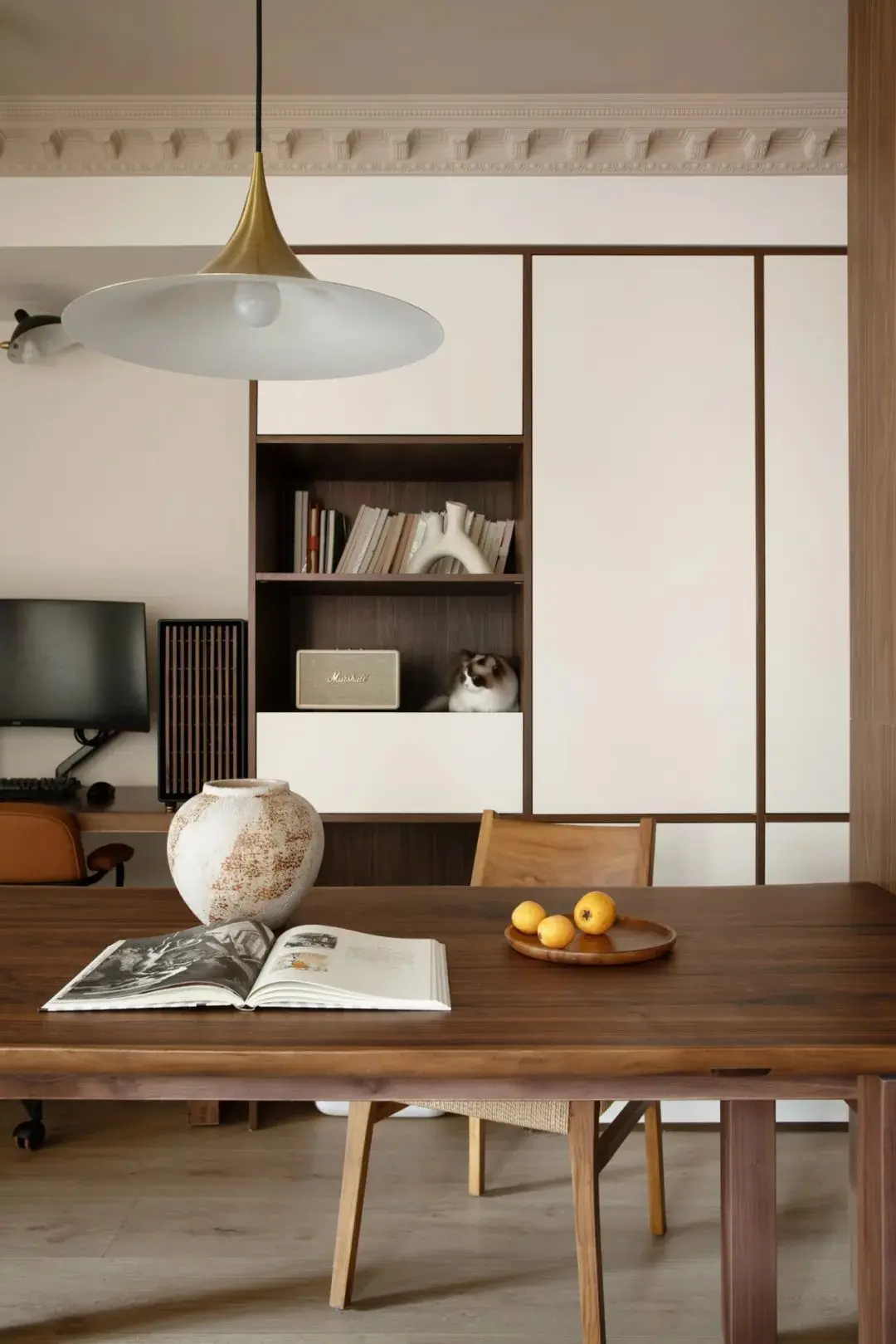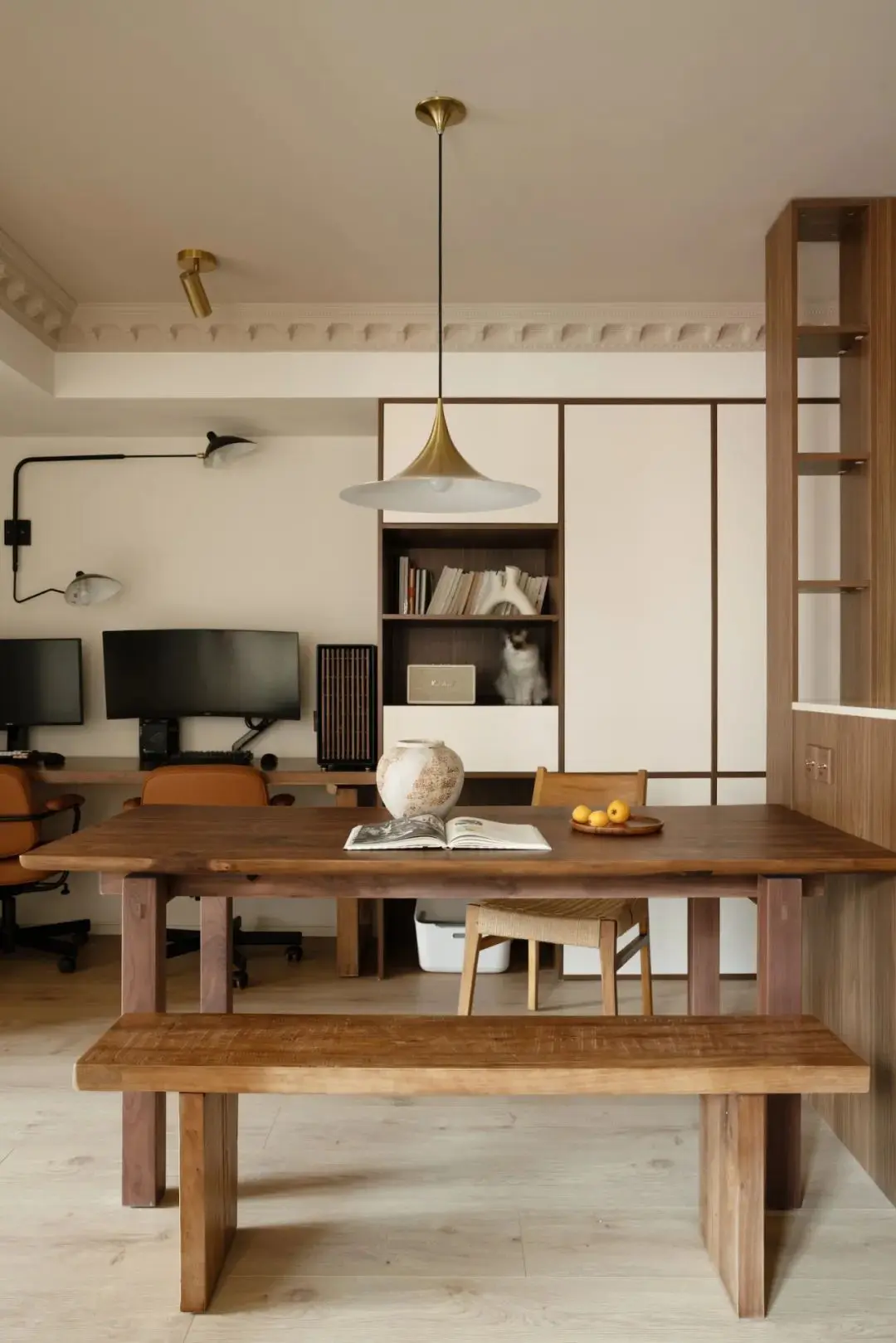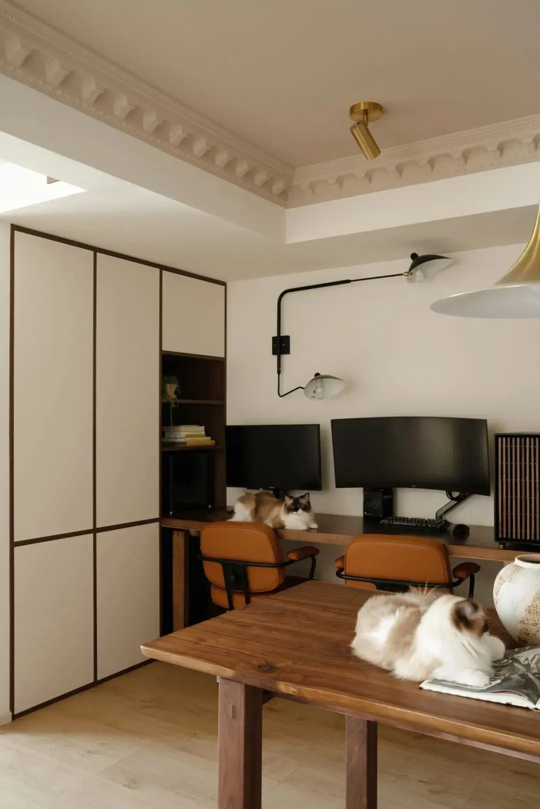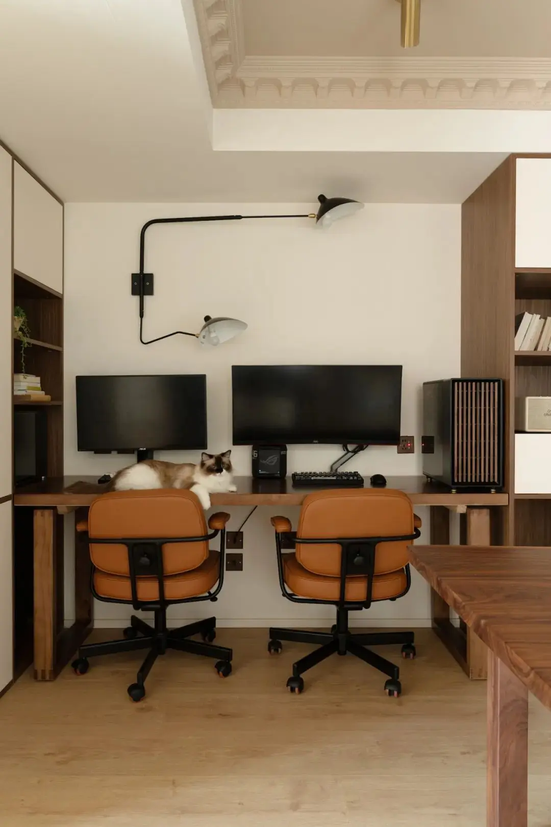 夫妻二人因游戏结缘,柜子延伸的两张并排书桌,对两人而言有着不同寻常的意义,可办公可游戏,这种陪伴感,让人心生温暖。