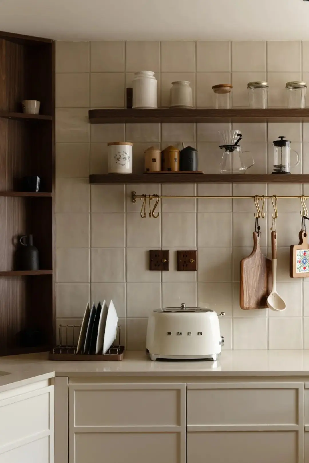 隔板+柜体的设计,藏下锅碗瓢盆的下厨工具,将好看器皿、碟子展露出来。