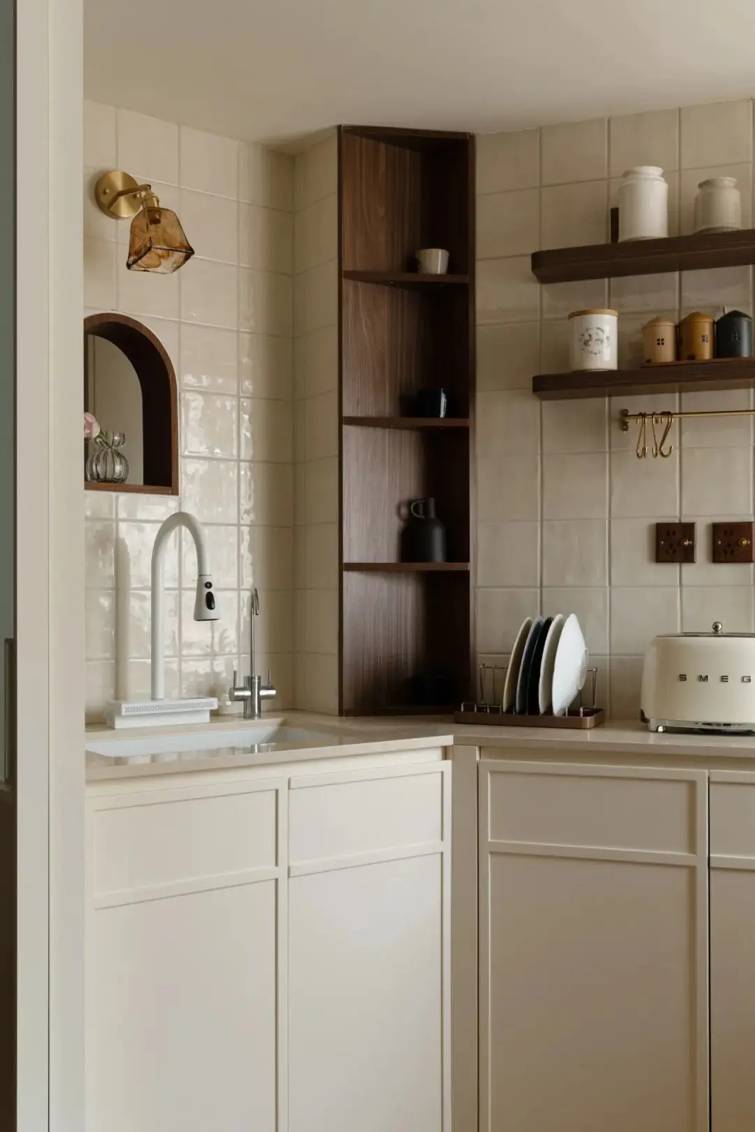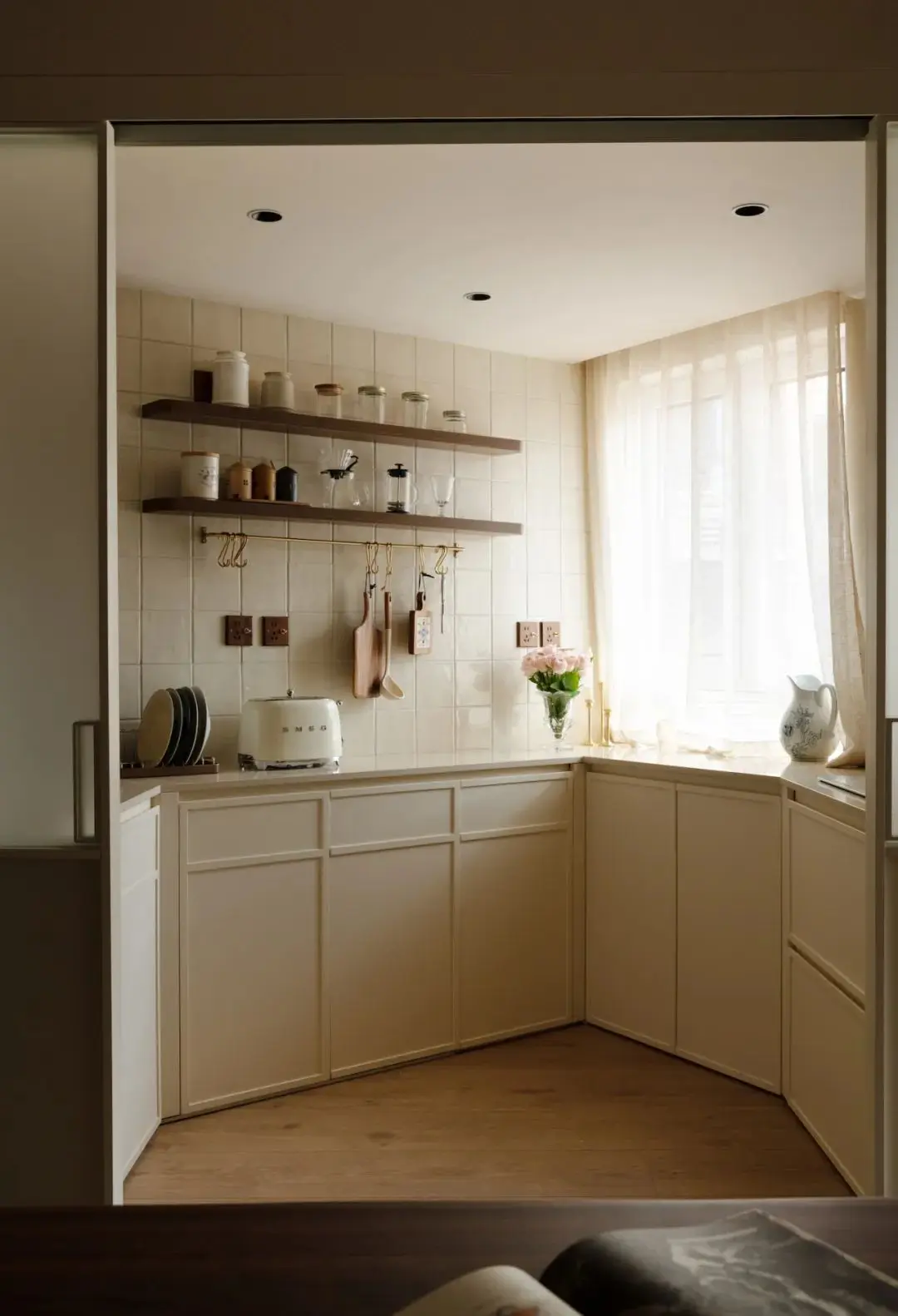 顺着异形窗区改造的厨房,可以有四面墙安排不同的功能,巧用转角处安排了收纳区,没有做吊柜,更适合整屋复古氛围。