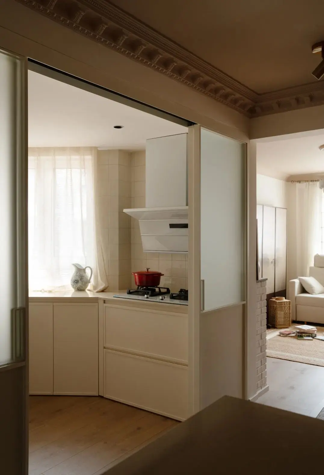 与餐厅相邻的厨房,为了方便日常使用,满足中西厨两用,两个功能区之间安置了推拉门,增加了空间的灵活性,通透的材质满足光线的自由流动。