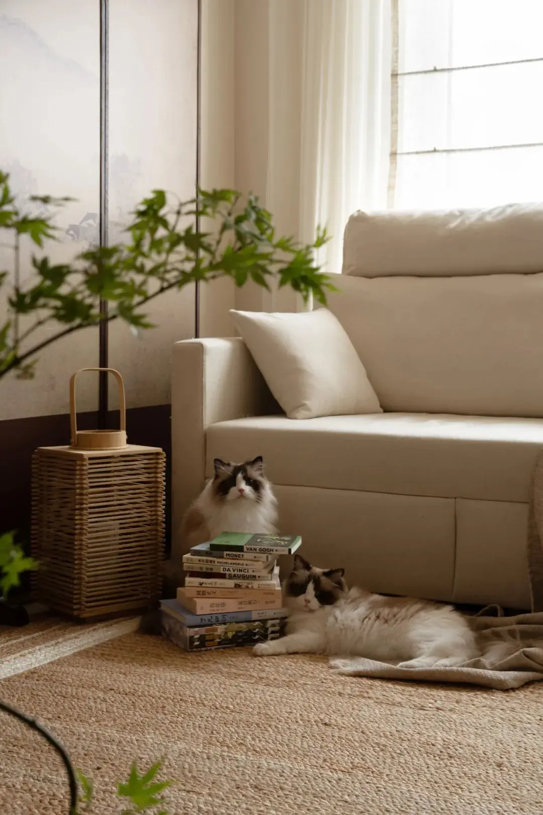 整个公共空间的柜体设计,进深为60cm,做的很深以及部分开放式,让猫猫多了一处藏身之处。