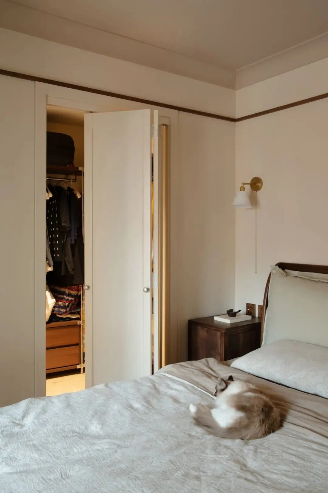卧室也预留了独立衣帽间,2~3㎡ 左右,收纳力满满,折叠门与墙色同色,可以隐形。