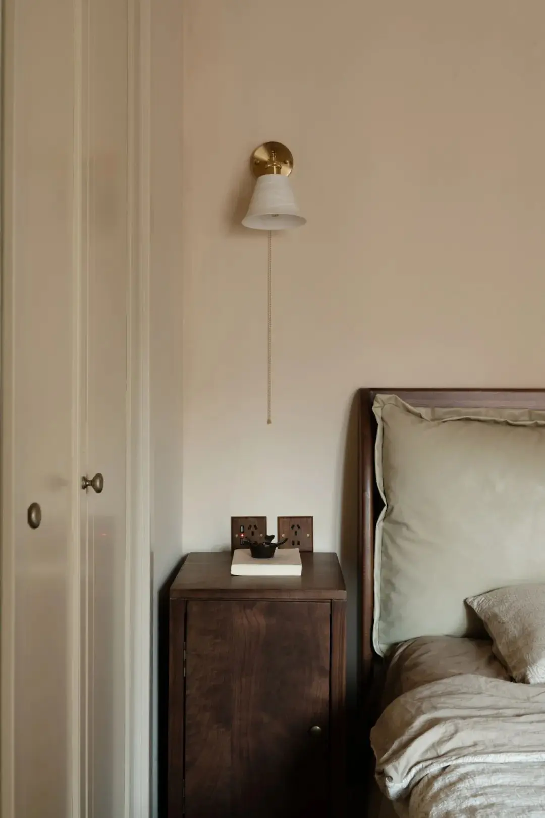 卧室整体风格较为古朴,白色、棉麻、深色原木等相得益彰的搭配,带来宁静的氛围。