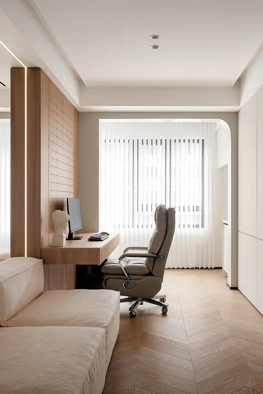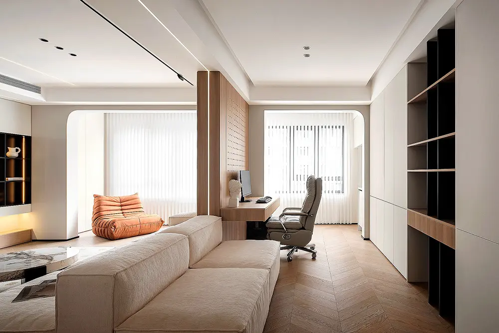 从客厅那开阔的视野中远眺,书房仿佛被一层神秘的面纱轻轻覆盖,若隐若现间透露出一种难以抗拒的吸引力,不仅激发了居者对于未知的好奇心,更增添了几分探索自我、追寻宁静的渴望。