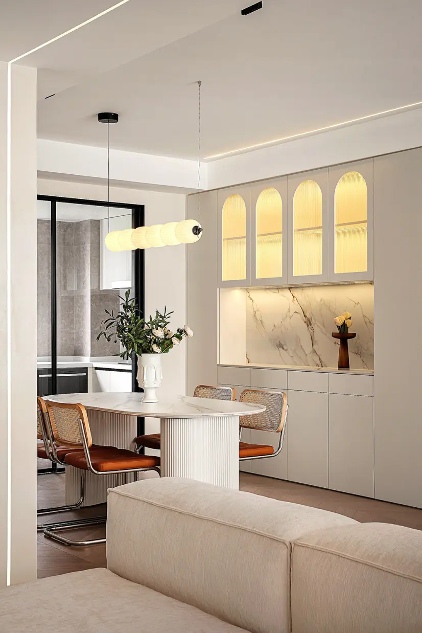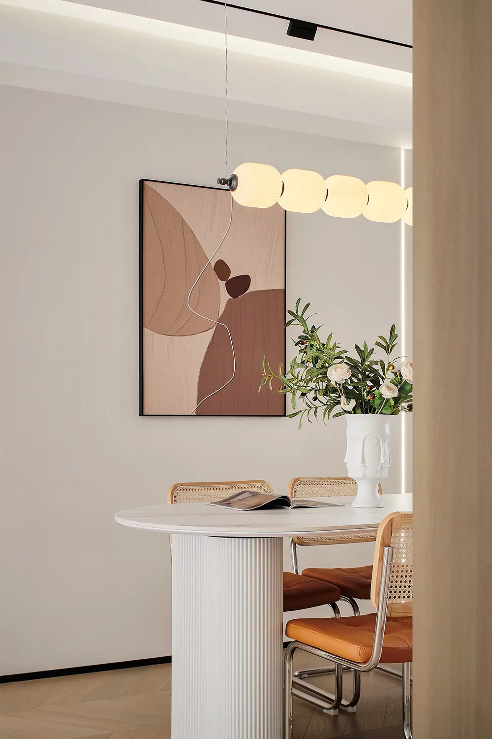 The fashionable chandelier hanging in the air, with its unique light and shadow effect, covers the dining table with a soft and romantic light. The edge of the dining table is cleverly designed with an arc, which not only adds a smooth and harmonious touch to the dining experience but also seems to silently tell the tenderness and tolerance of home.