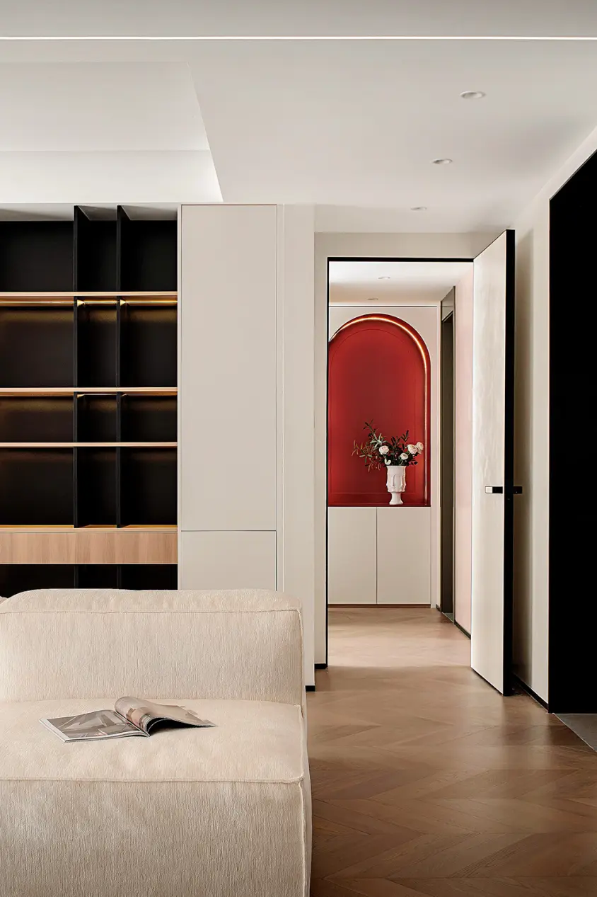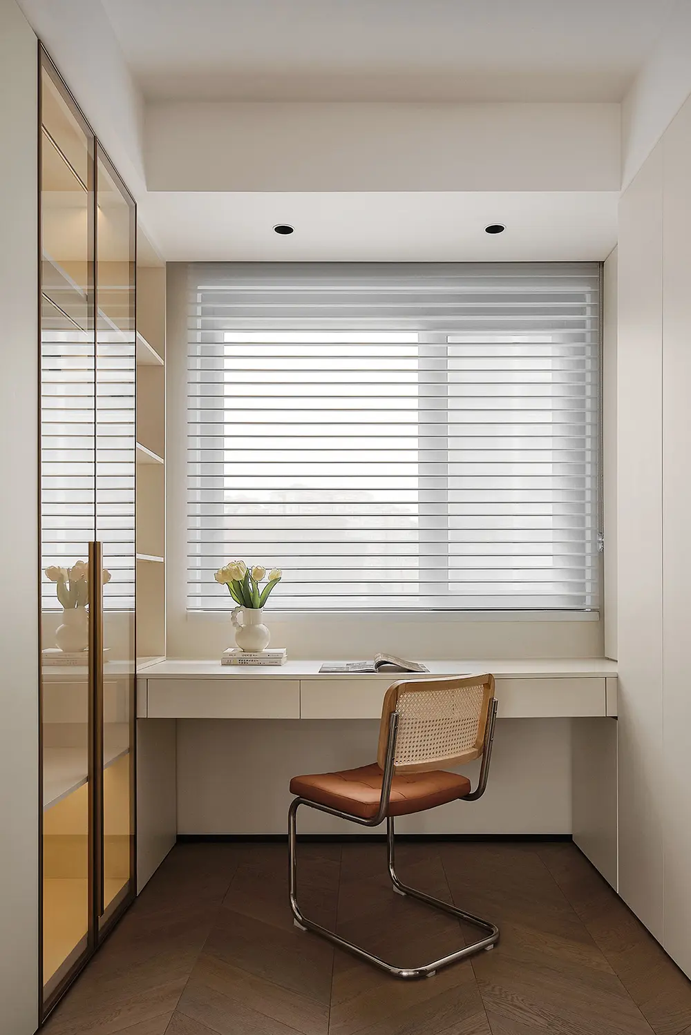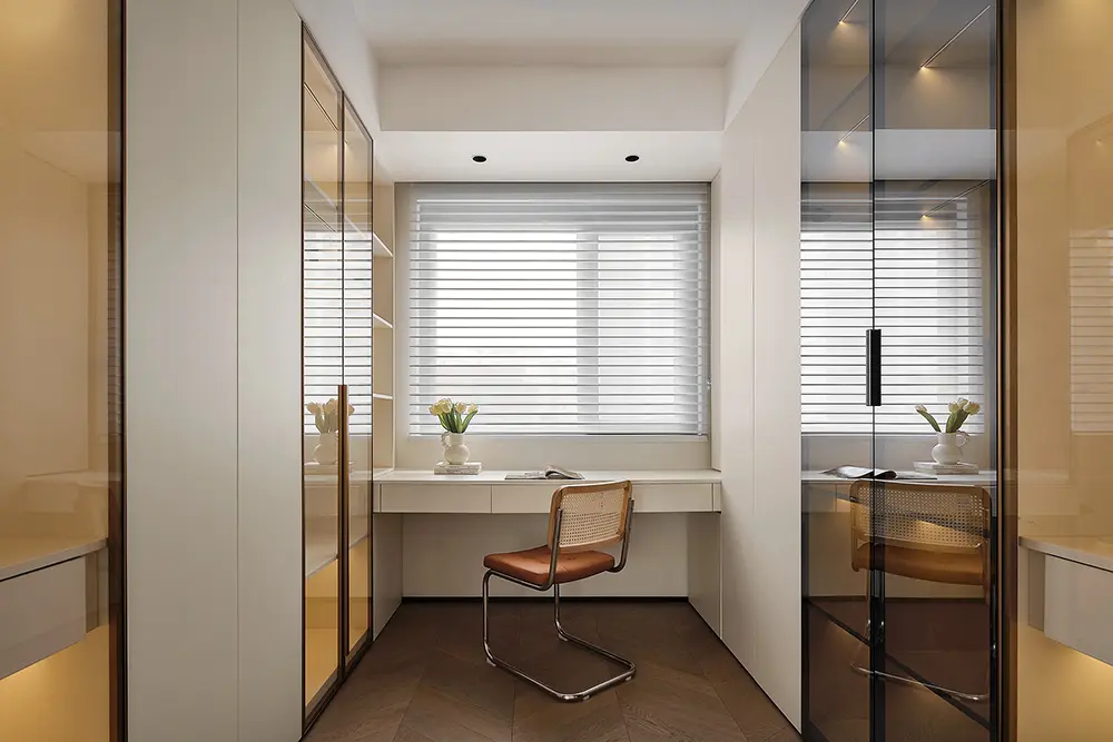 Looking into the distance from the open view of the living room, the study seems to be gently covered by a mysterious veil, revealing an irresistible attraction in the intermittent appearance. It not only stimulates the resident's curiosity about the unknown but also adds a desire to explore oneself and pursue tranquility.
