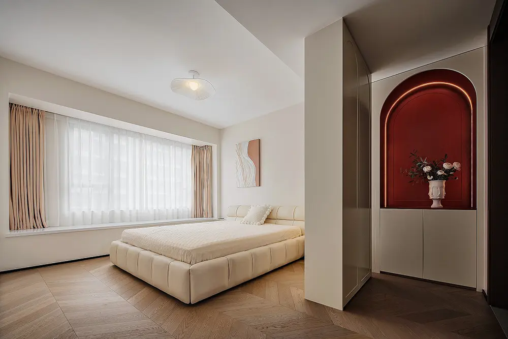 Entering the master bedroom, the passion of red comes, like a flickering flame, warm and passionate. This red not only ignites the temperature of the space but also foretells the warmth and vitality of the home, making people feel a comfort and relaxation from the inside out.