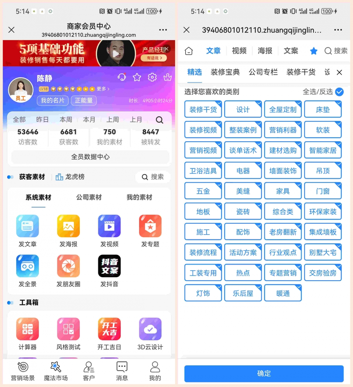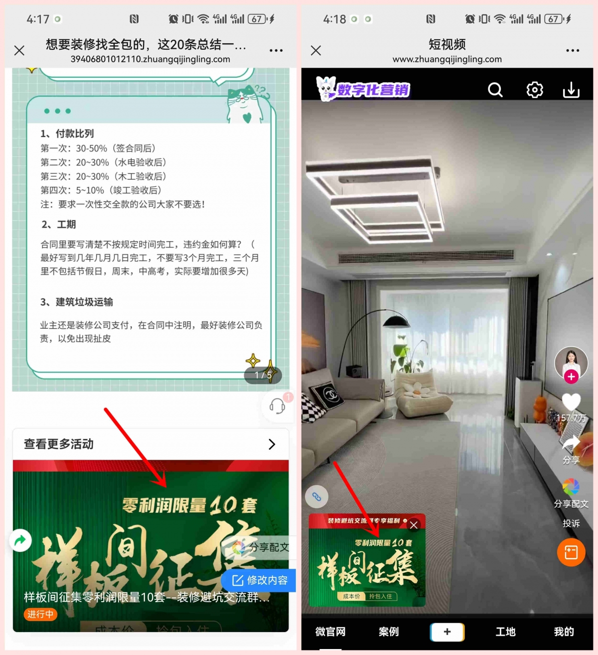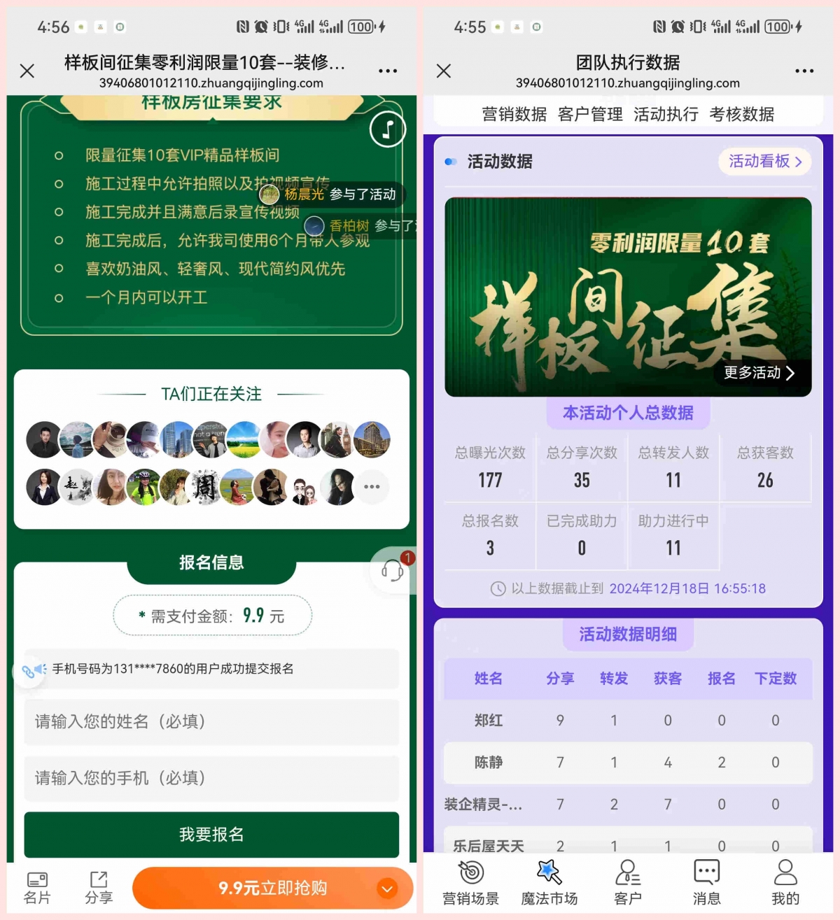 活动期间,除了可以直接分享活动外,还可以让员工到系统的素材库分享装修文章、视频等能“抓客”的资料到朋友圈、业主群,既可以维护客情,又能知道客户动态:有没有点击,从而便于进一步邀约。