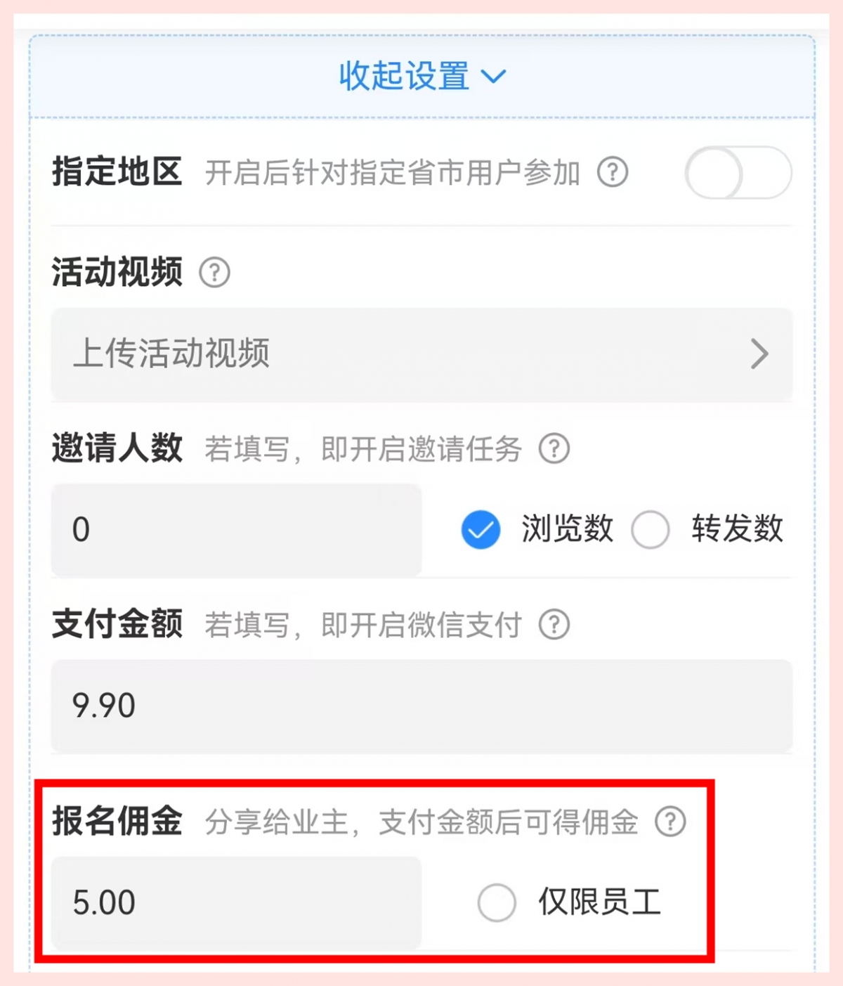 活动推广页可设置报名分销佣金
