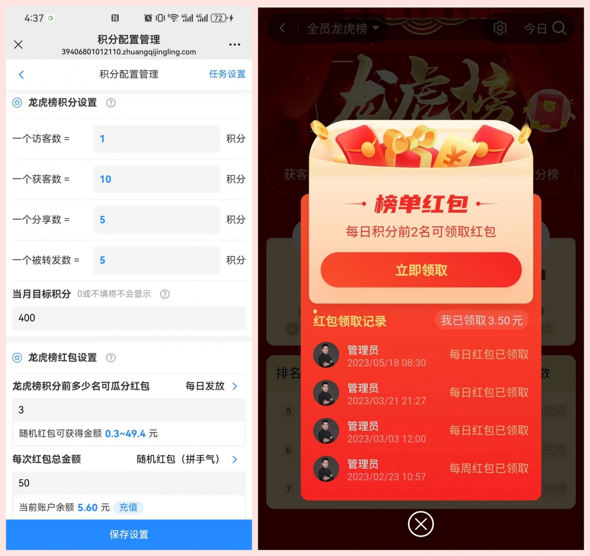 员工每天的执行分享,龙虎榜排名如前10名的,可自动领取一个3-20元的随机红包。