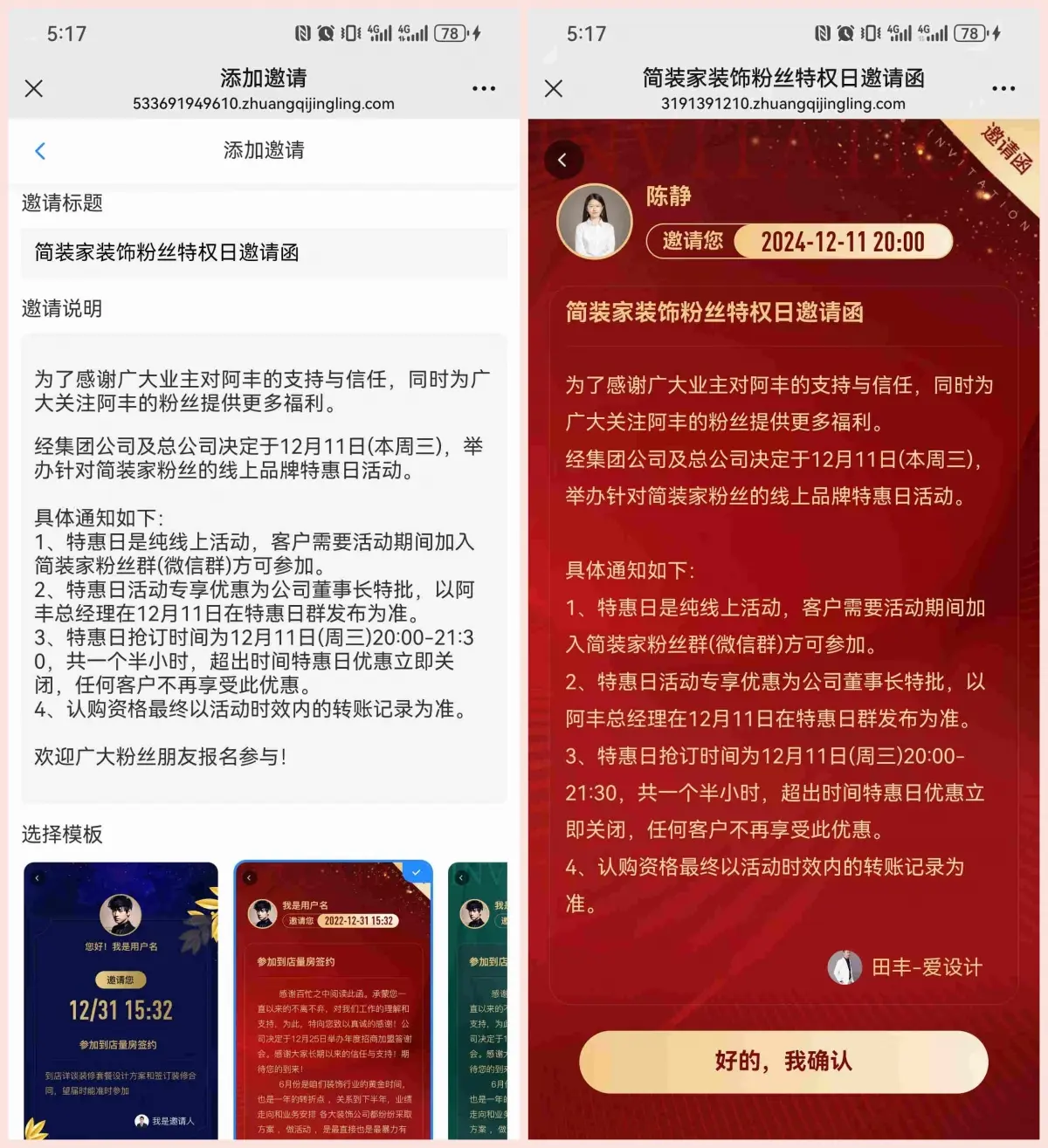 可以创建邀请函,有现成的文案模板、背景模版,支持业主点击确认邀请,加强契约精神。