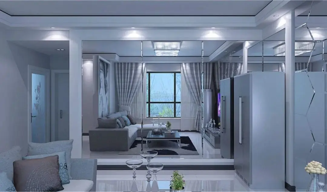 要选择合适的位置进行点缀运用,比如光线暗角,以块状或条状布置为宜。忌相同面积的镜子两两相对,那样会使人产生不舒服的感觉。