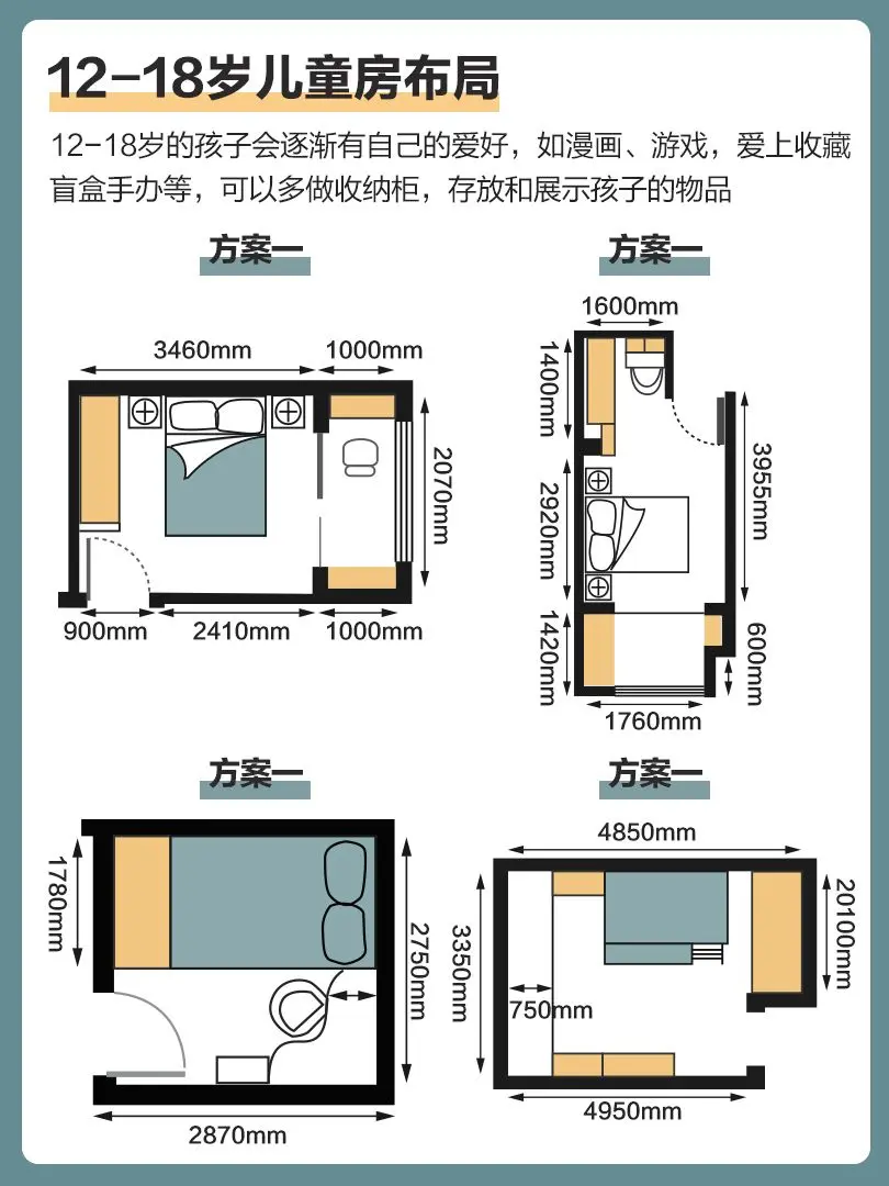 ④12岁+:把孩子当成一个成年人对待,没必要再去做更多的监督,也就不需要“儿童房”这个概念了,按照一个正常的房间布置即可。