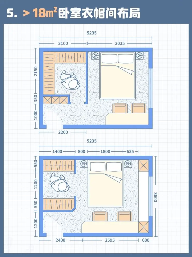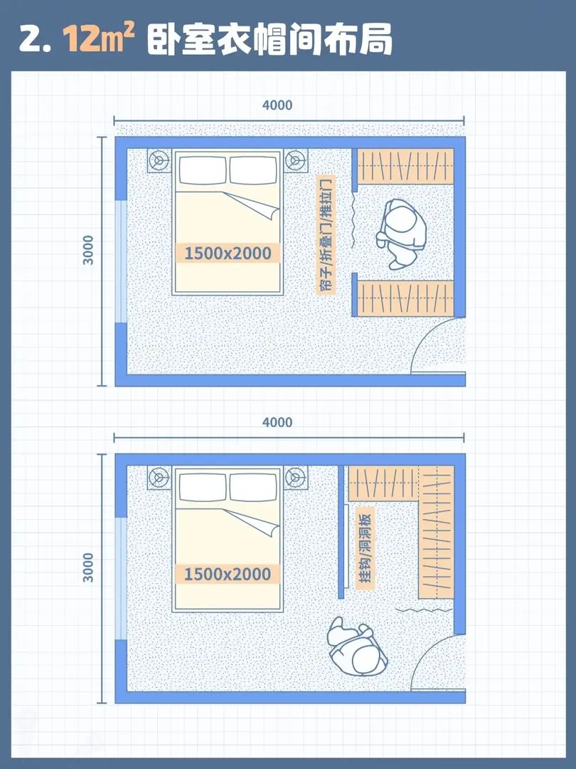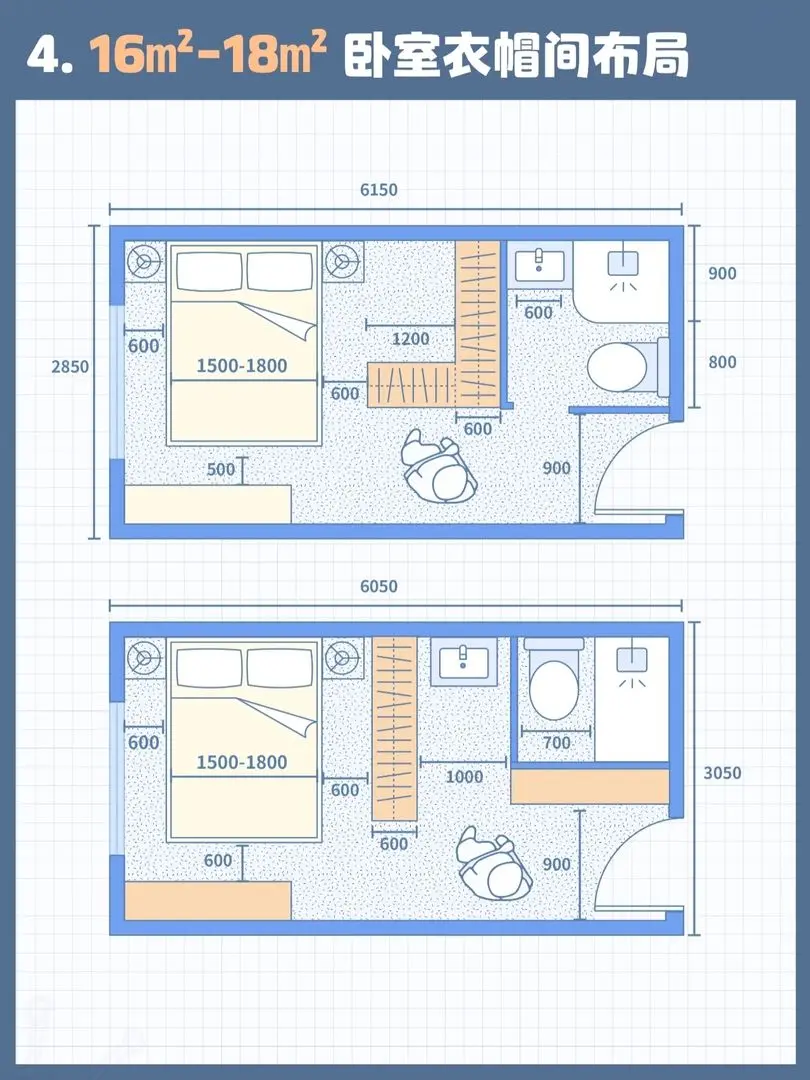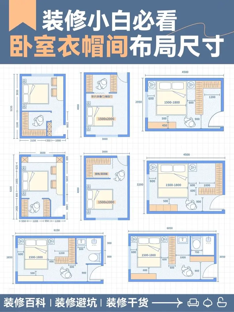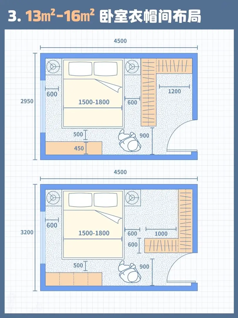 一个卧室放下床,留出一个过道和床头柜的距离大概需要6.5平米,如果再加一个小衣帽间,至少是9㎡。假如卧室小于9平米还想放衣帽间,可以考虑在层高上下功夫,通过抬高床架,设计迷你衣帽间。