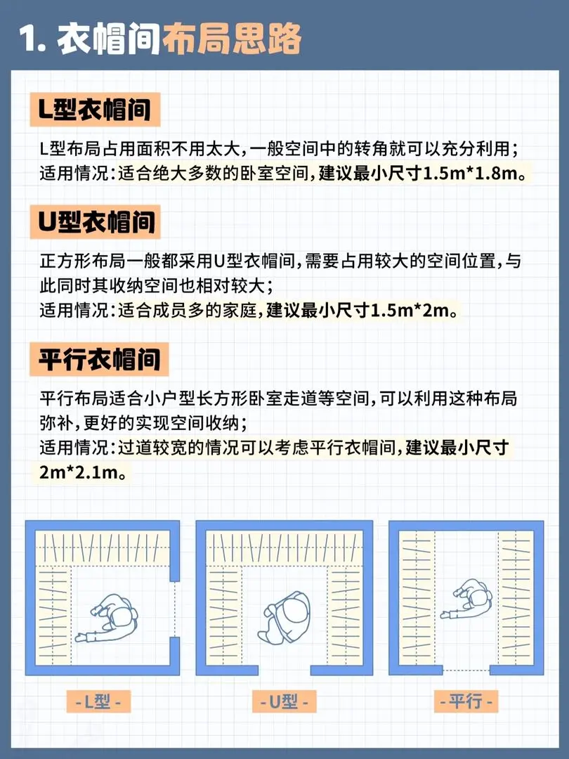 最小需要到3-4平米就够了,呈现U型或L型,柜子的深度一般是500-600mm,如果做开放式,400-500mm也可,如果低于这个尺寸只能设计成放小物件饰品之类的,再加上站立通过:600mm 以上,3平米做一个衣帽间是相对舒适的。