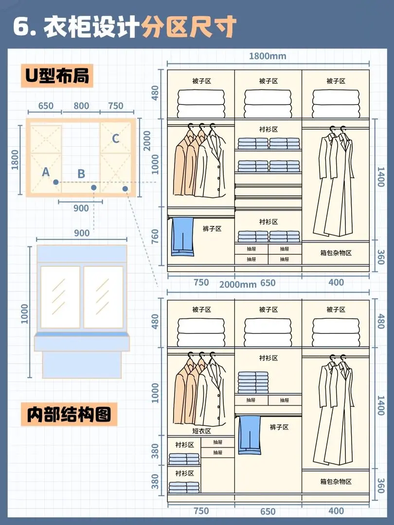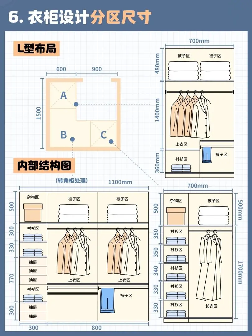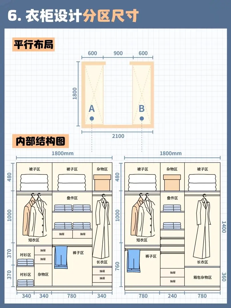 悬挂区要分长衣区和短衣区,长衣区的高度要预留1500mm,短衣区的高度建议预留900-1000mm。