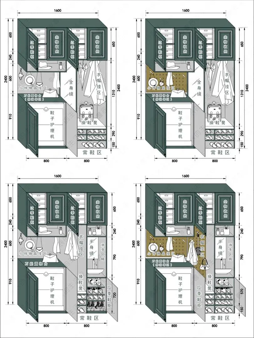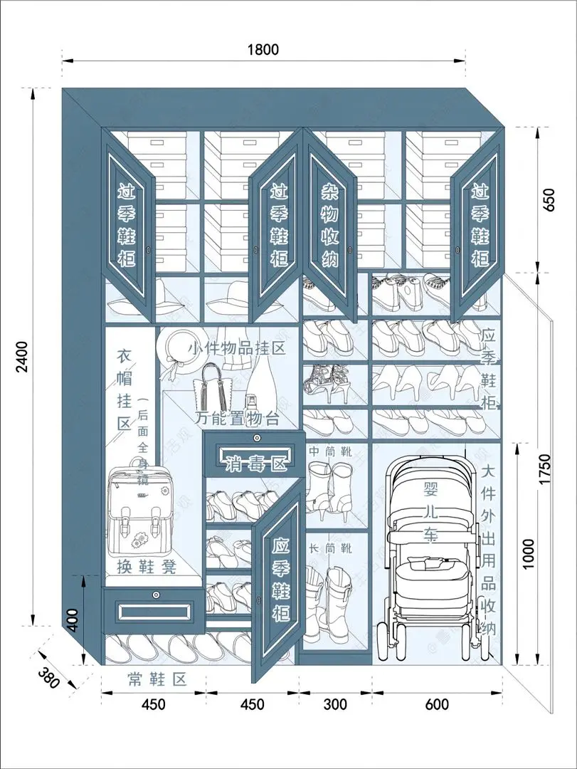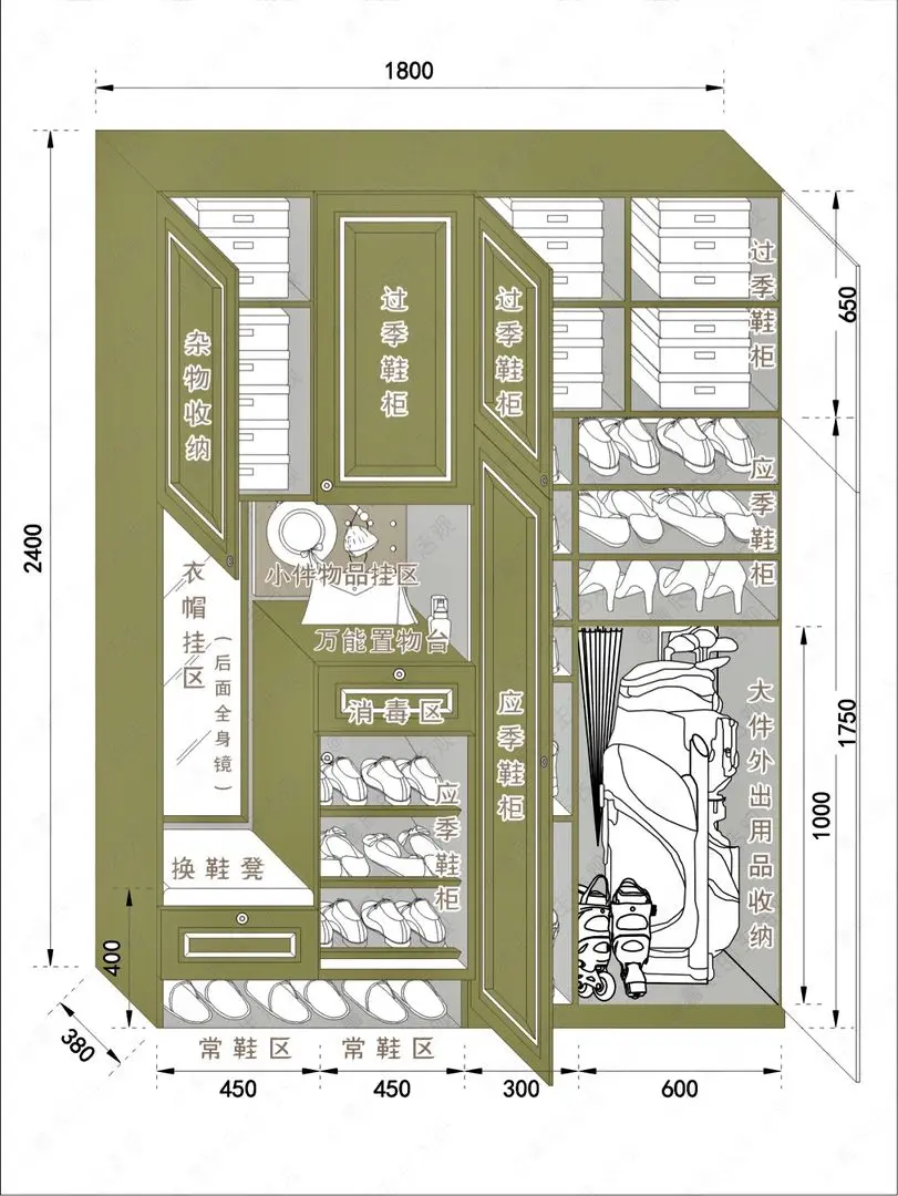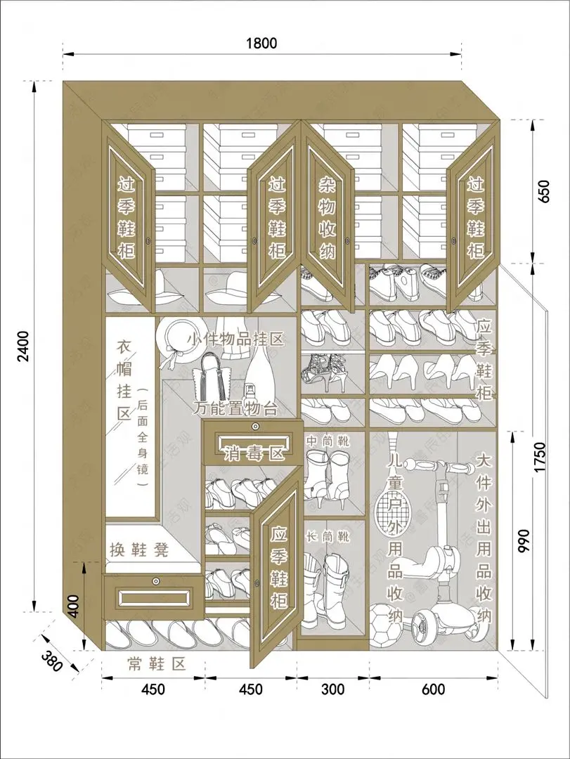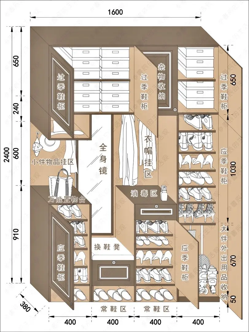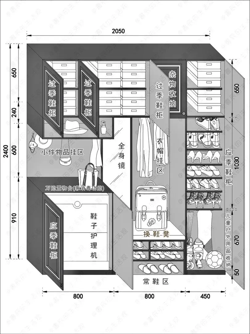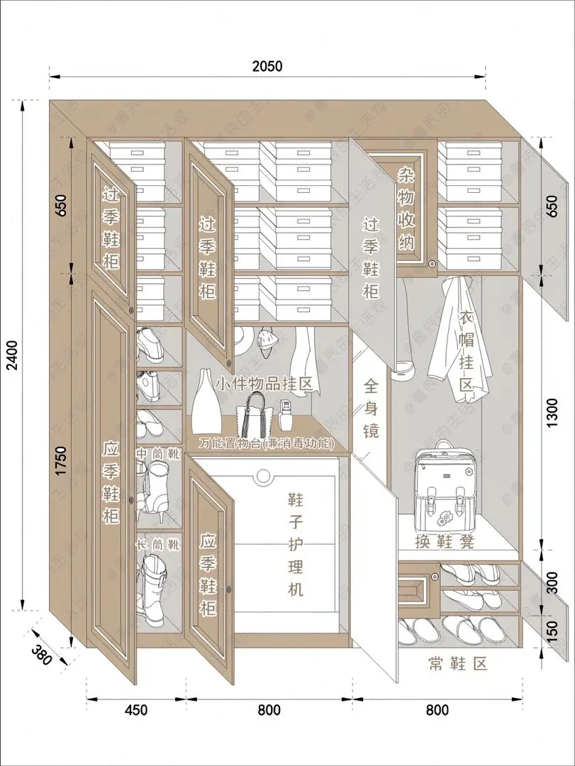 可以根据家里的鞋子种类来进行设计层板的高度,比如家里女性长筒靴比较多,那么可以考虑其中一个空间设计成50cm层高。