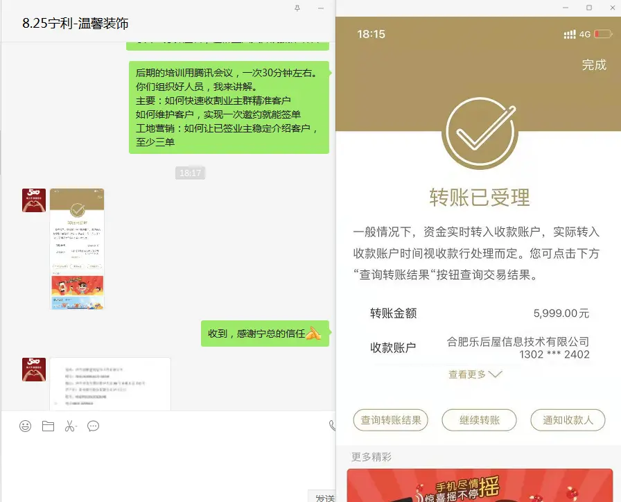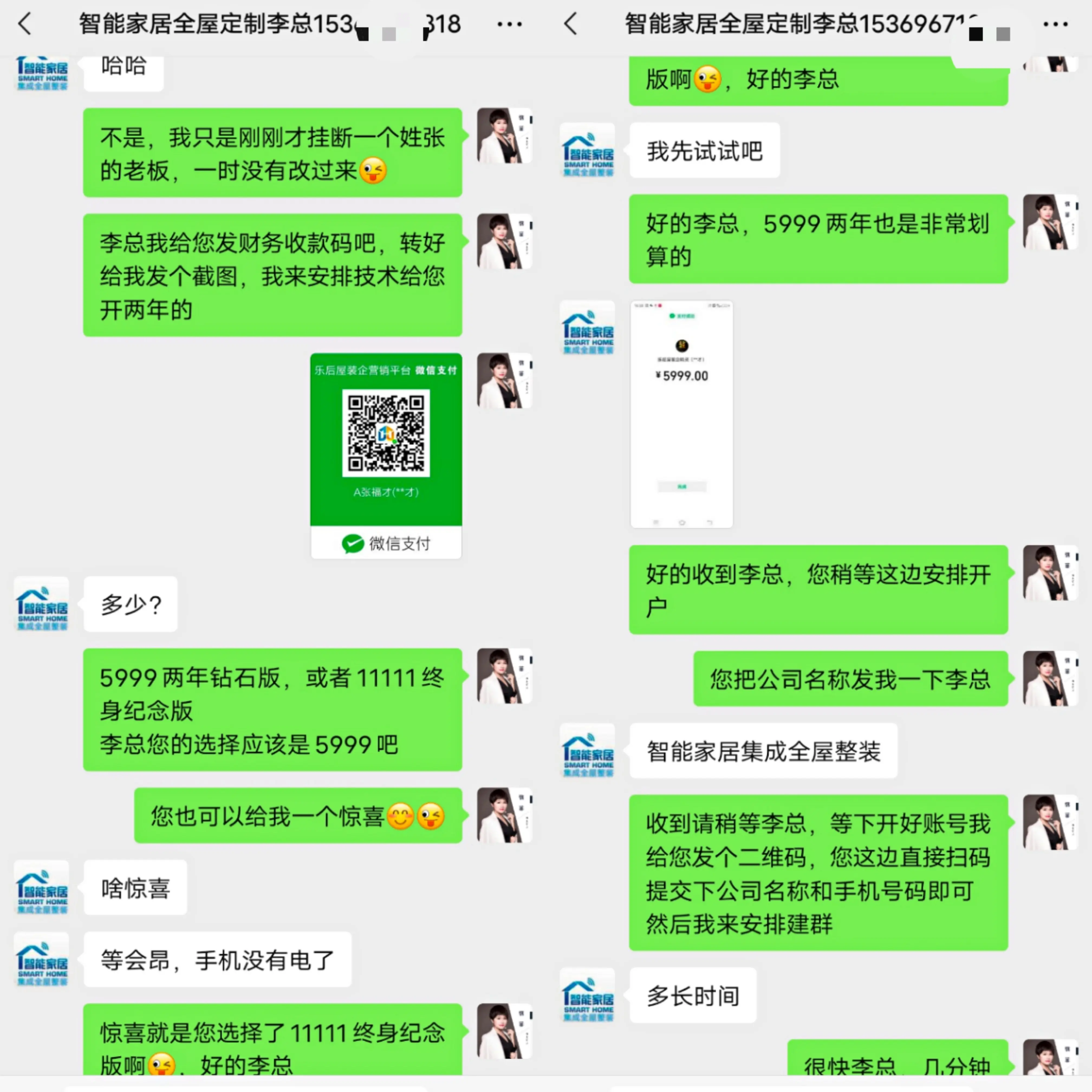 装企精灵全国统一价,附客户付款截图;如果市场有不同价格,可能涉及功能不同、不能正常使用、虚假信息、不正当途径购买查处被封号风险,请即时联系总部核实,以免上当受骗、遭受损失。核实电话:400 672 2009