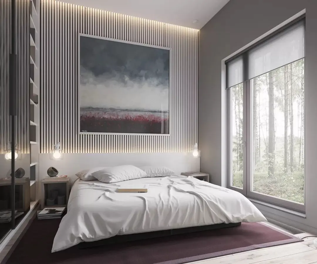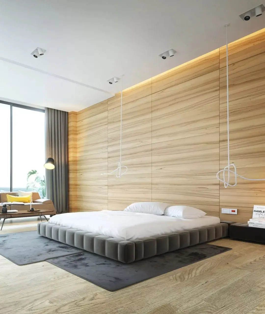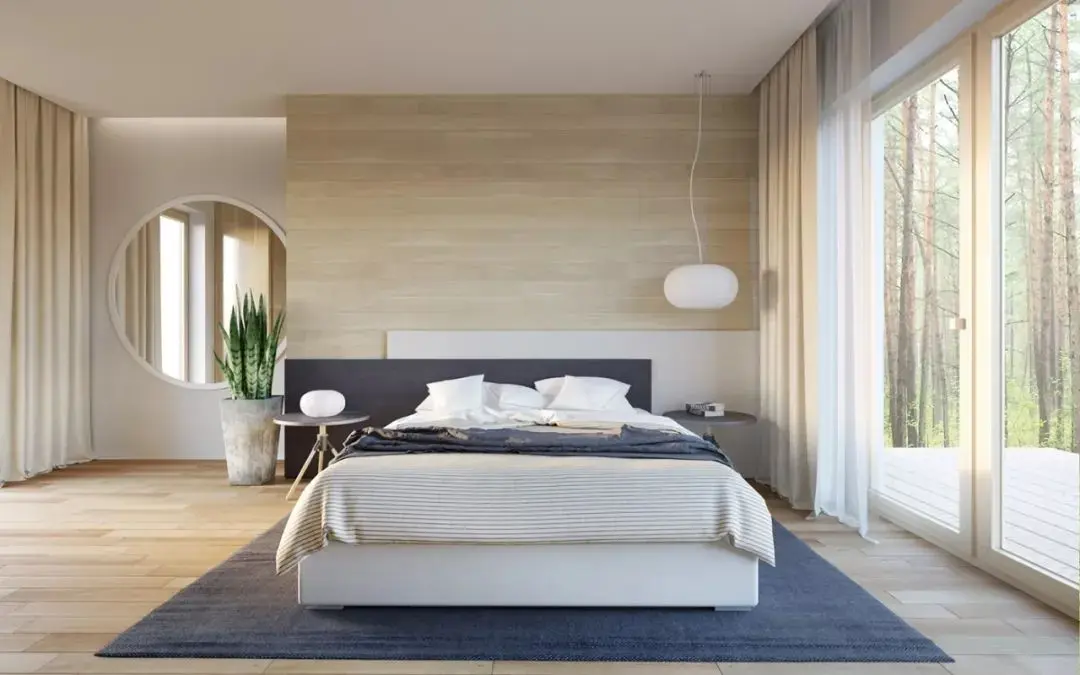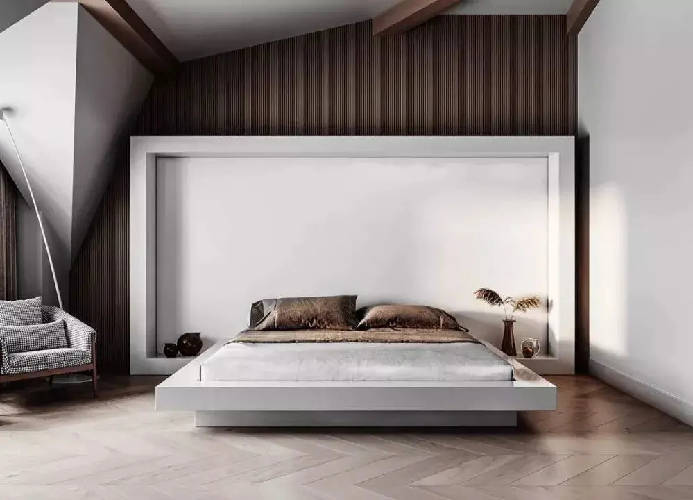 床头背景墙建议选择木纹饰面板或者石膏线、护墙板,预算不够的可以考虑用挂画给墙面来点变化。