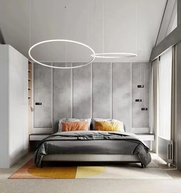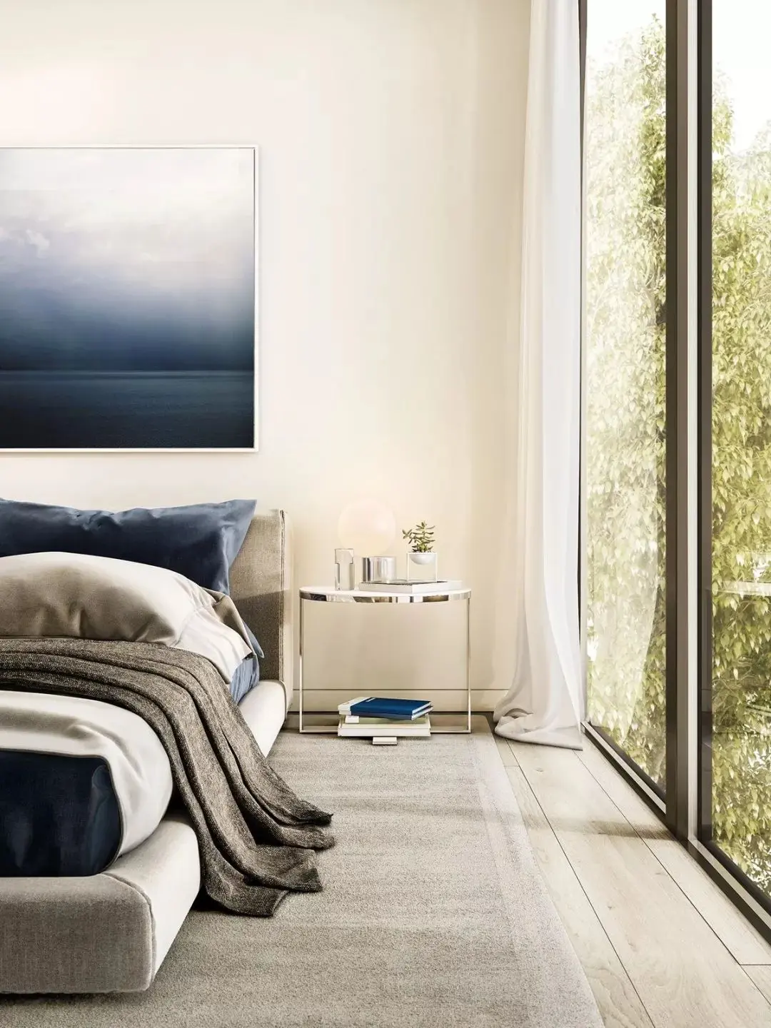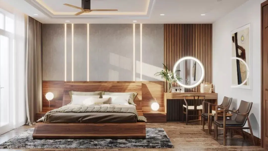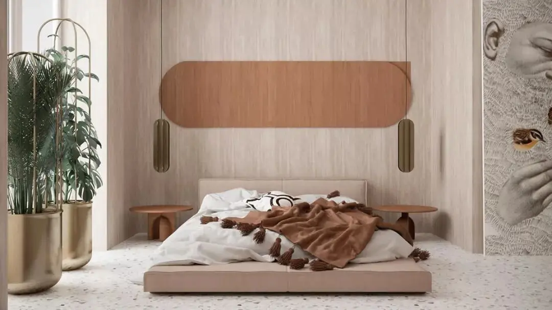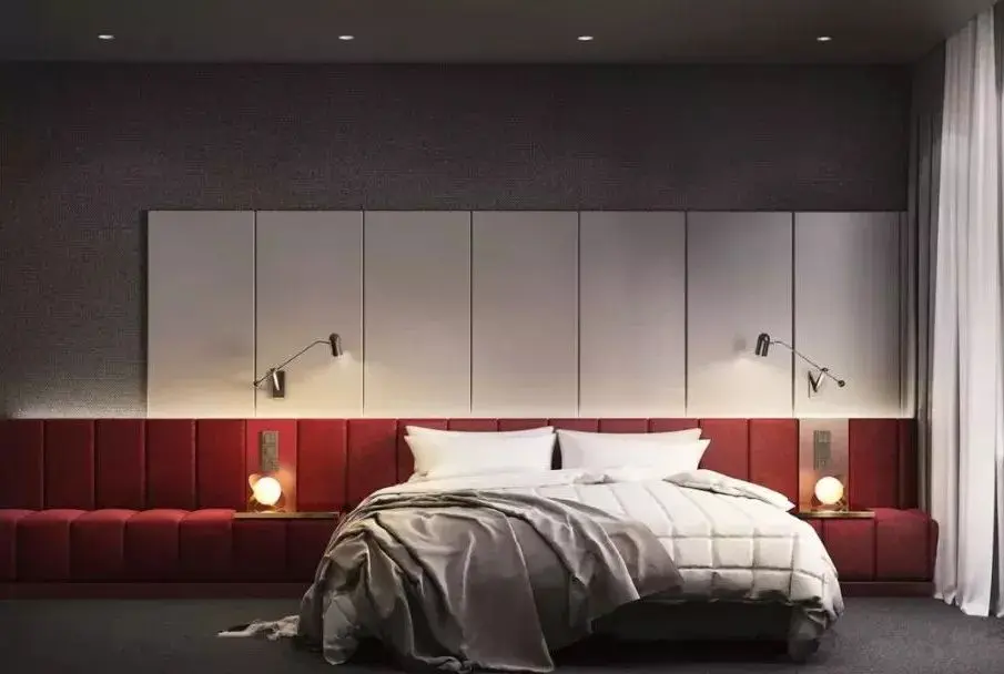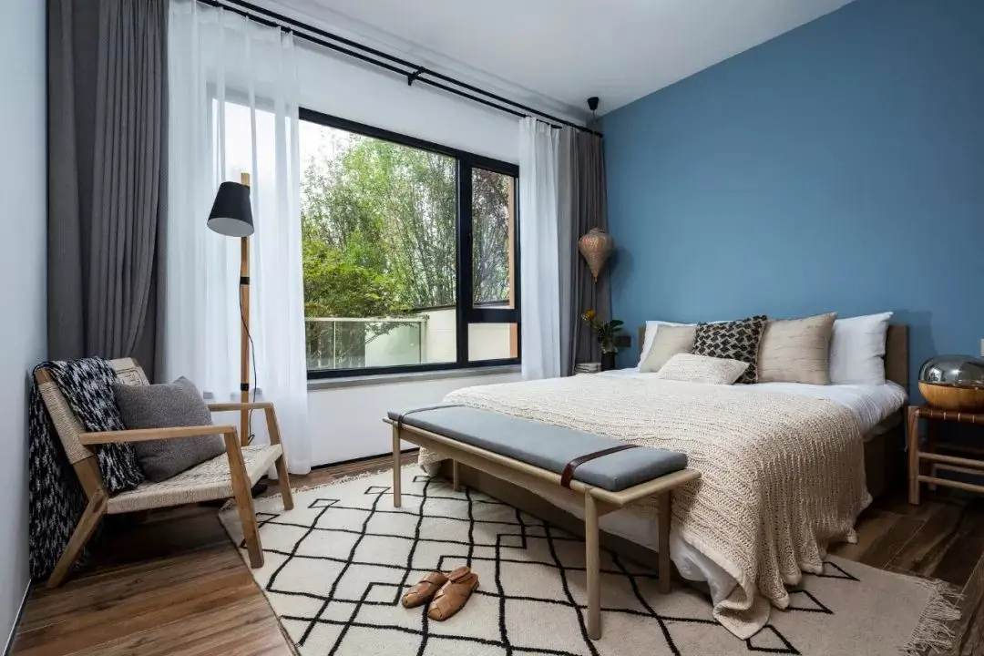 床头背景墙建议选择木纹饰面板或者石膏线、护墙板,预算不够的可以考虑用挂画给墙面来点变化。