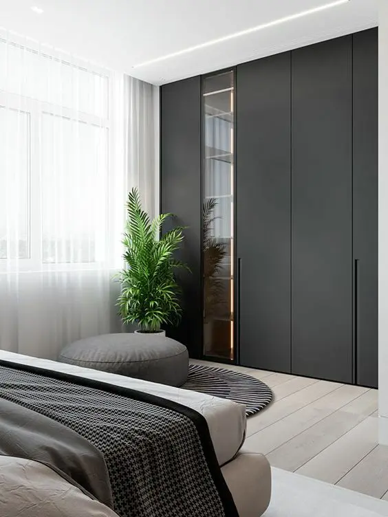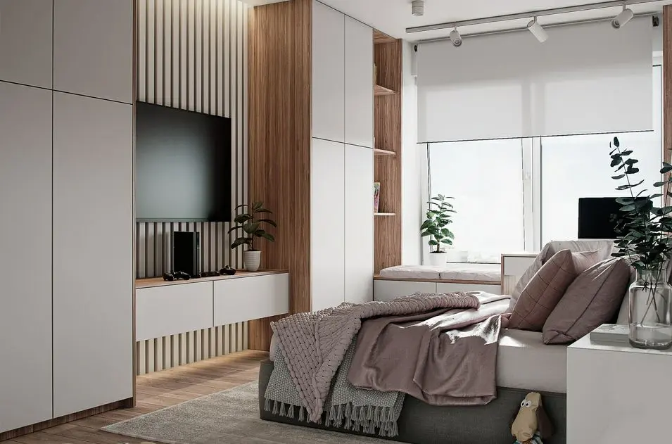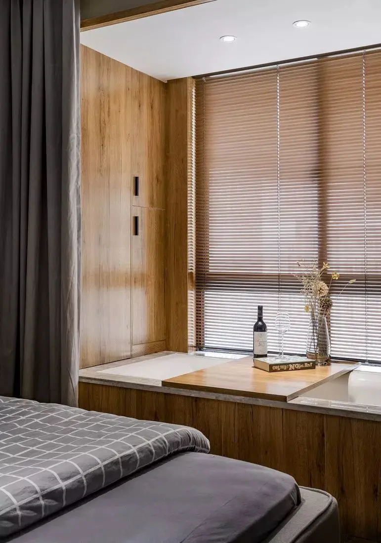 如果想增加收纳空间可以设置飘窗柜、床头收纳柜、顶天立地的衣柜,都很实用。