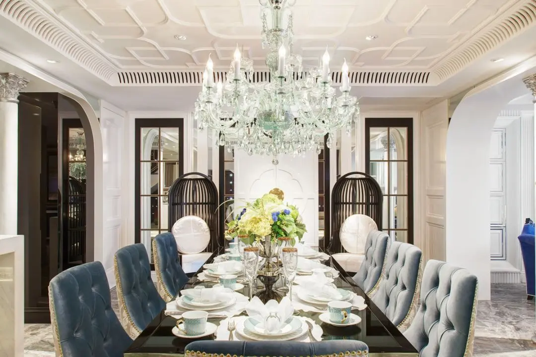 餐厅光滑的西式餐桌上折射着灯光,绝美的灰蓝色餐椅像甘甜柔美的鸡尾酒一般低调、沉静,使人沉醉其中。座位排列十分考究,诠释了上流社会一丝不苟的仪式感,更显示出了主人对客人的重视。