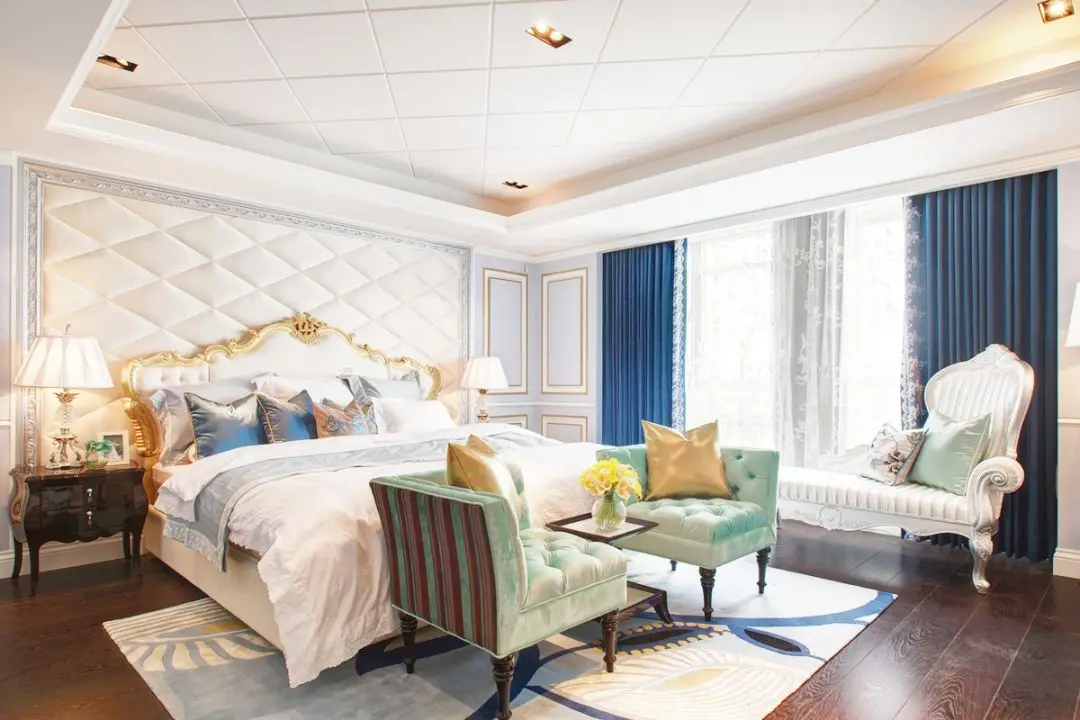 主卧设计非常大气,整个空间给人以开放、宽容的非凡气度。床头皮质软饰和精致雕花,咖啡色实木床头柜、薄荷绿的小沙发,多重时尚元素的融合演绎新古典卧室的从容、奢华与唯美。