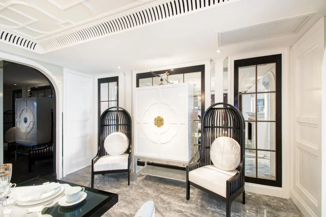 鸟笼造型靠背椅搭配装饰着金属锁扣的餐柜成为空间的亮点,将白色的洁净与优雅,黑色的低调与沉稳完美诠释,塑造出纯粹、清澈的居家品位。