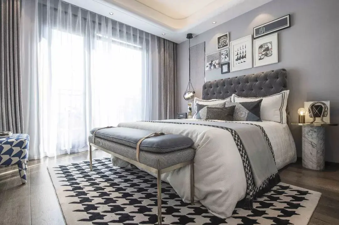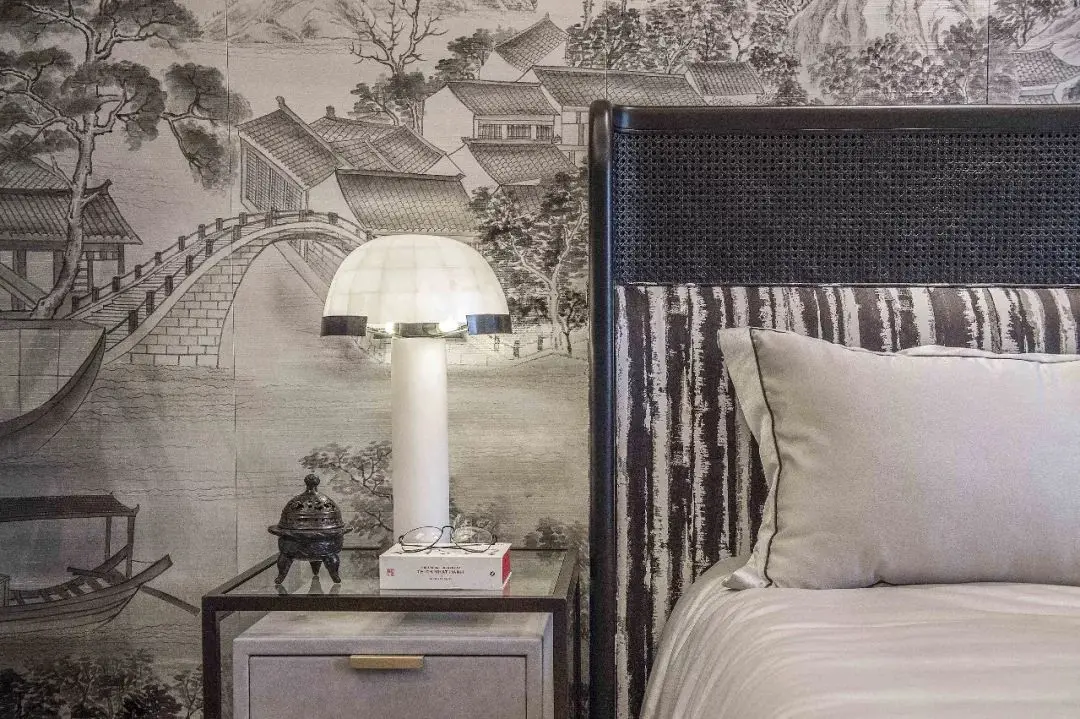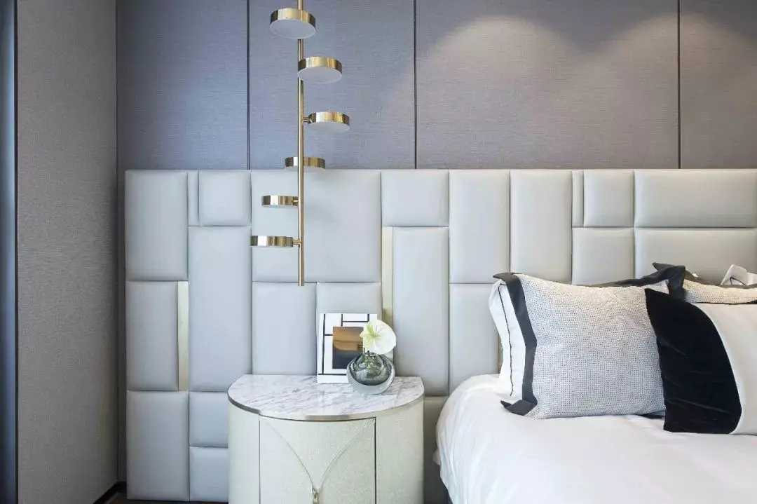 ▲黑白搭配像一道瀑布飞流直下,床头金属质地的灯具打造了一个具有轻奢质感的休息环境。