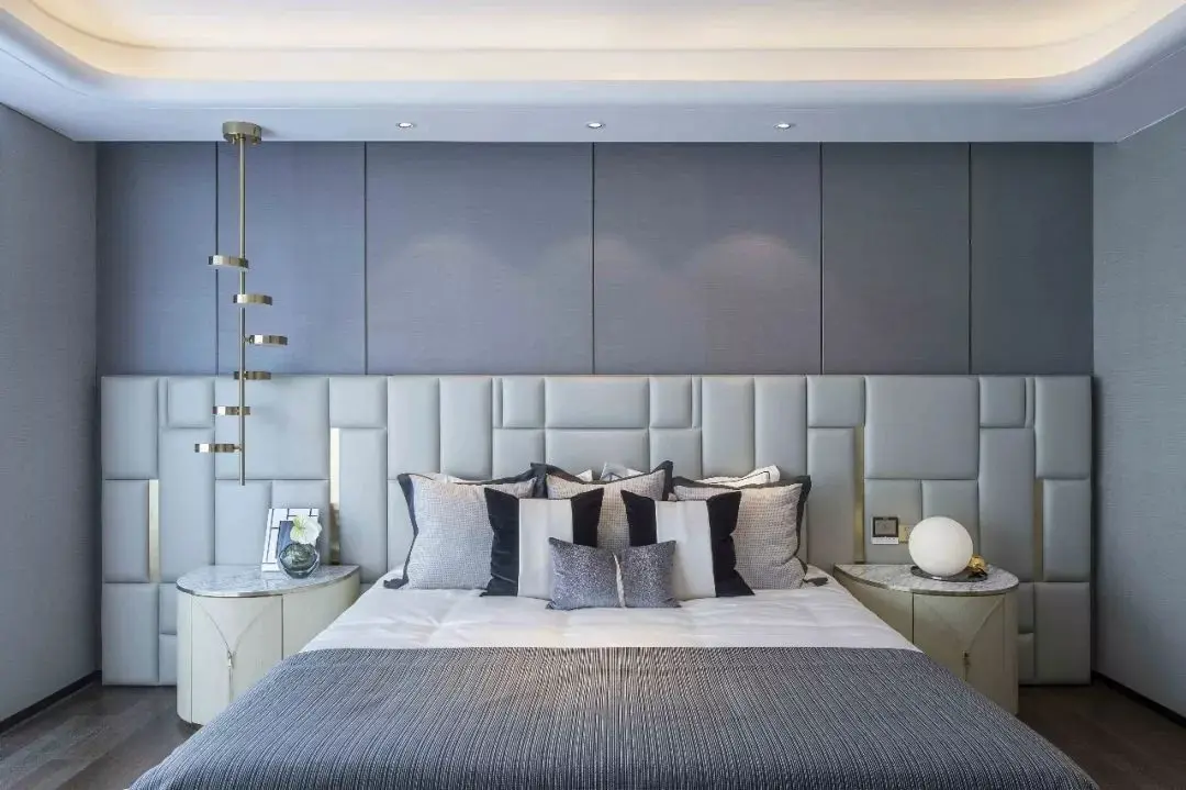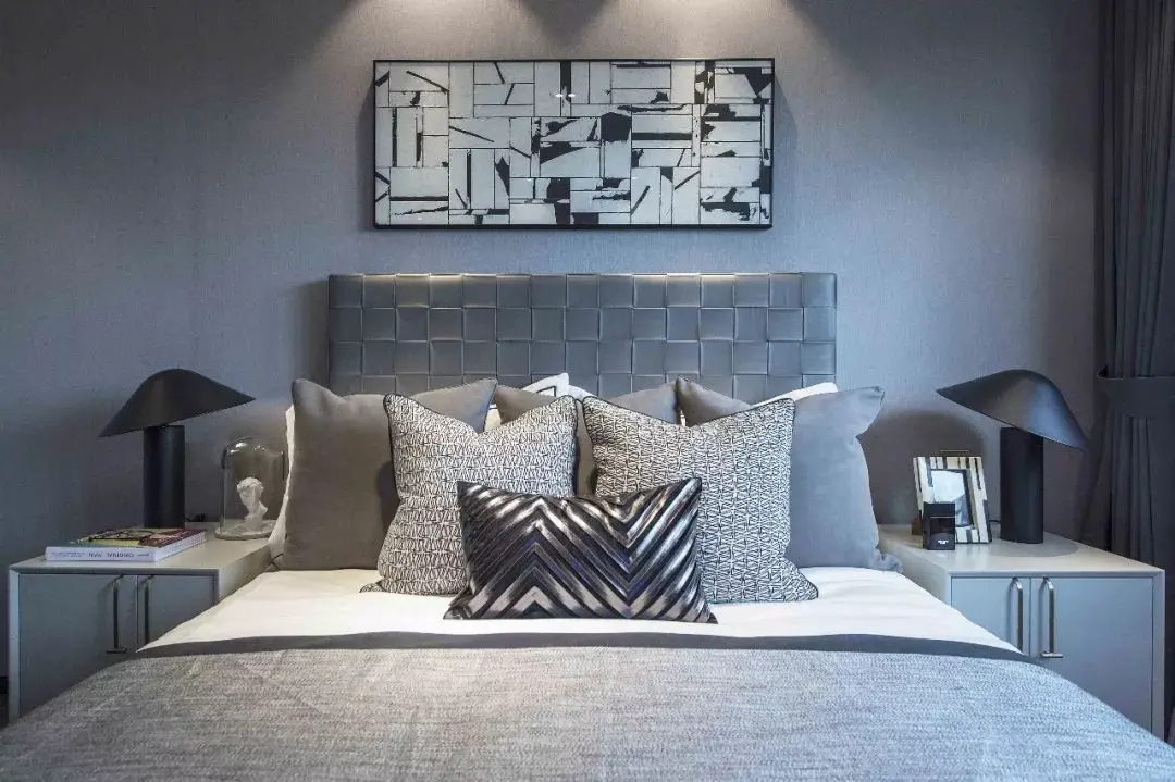 ▲暖色系灯带在视觉上来弱化高级灰带来的冷冽感,卧室设计栗色居多,整个卧室看起来温暖且舒适,一幅简约的水墨画和黑蓝色的软饰相辅相成。