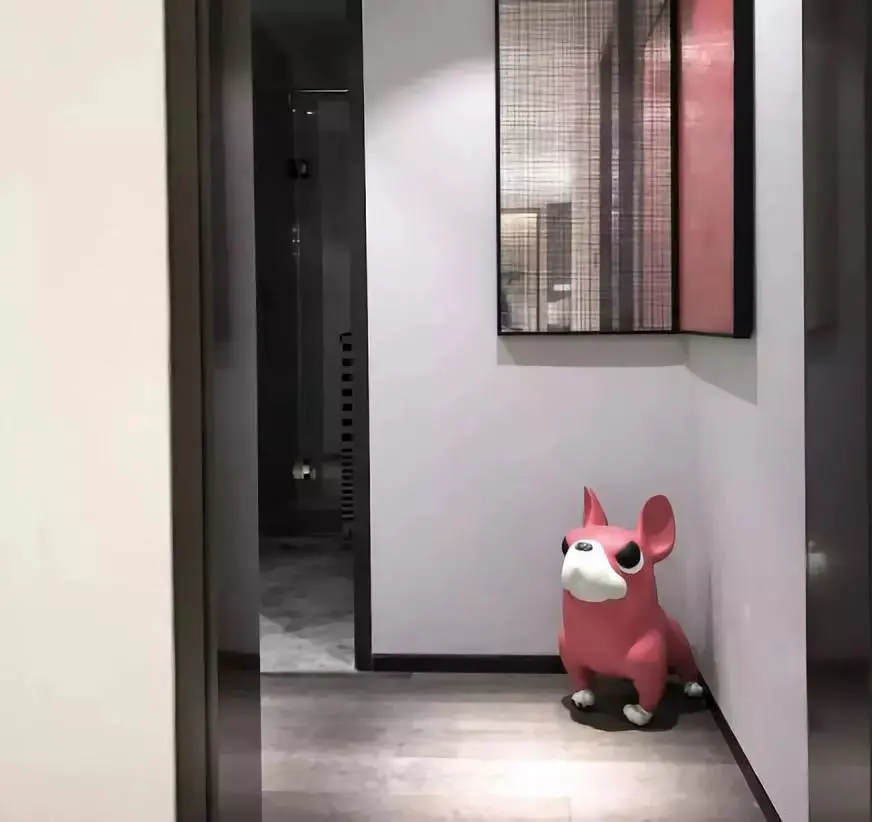 ▲儿童房门口放置了粉色汪星人,整个房间以黑灰为主,加上小孩喜欢的棋盘元素,这个空间绝对是男孩最喜欢的空间。