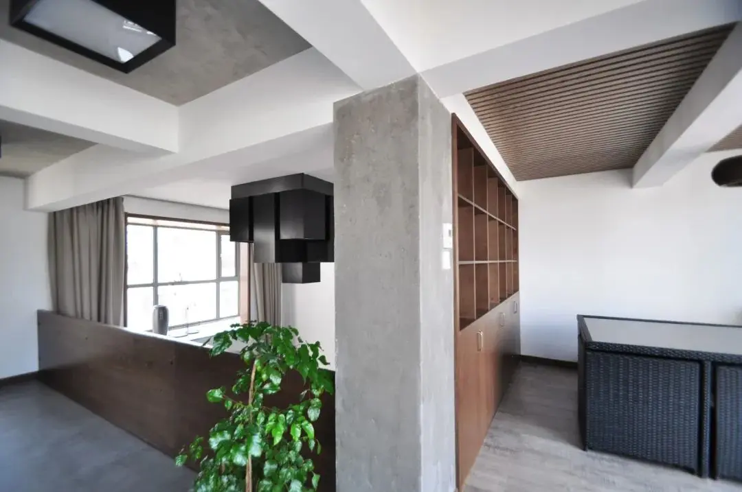 ▲客厅地面在哑光灰色的复古砖地面基础,在过道旁的柱子也是保留了水泥灰的质感,实木框架的沙发也是垫上脏灰色的布艺坐垫靠背,结合原木质感的茶几,让简洁的空间也更加简约稳重而舒适。