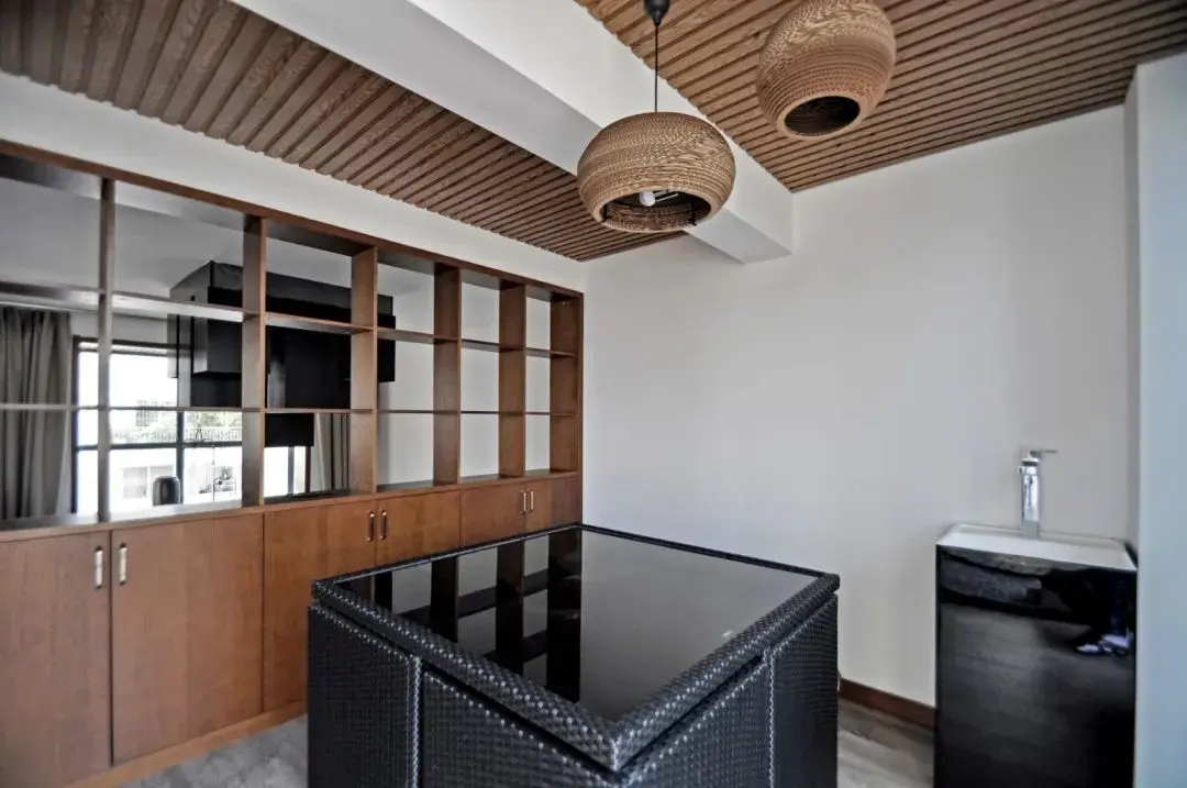 ▲在沙发墙后上方的隔断柜后,就是茶室空间,天花以木质吊顶,装上编织吊灯,摆上编织的玻璃台面休闲椅,角落还有一个洗手台,整个空间显得简约实用而现代。