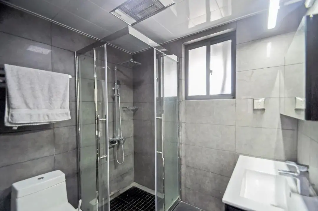 ▲卫生间在灰色的墙砖空间下,马桶、淋浴房与洗手盆以三角分布的格局,整个空间简洁舒适而实用。