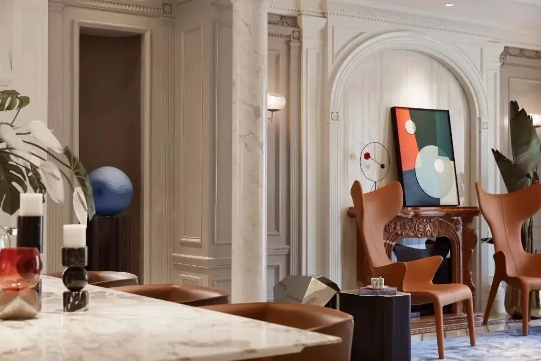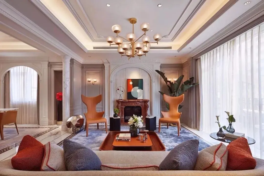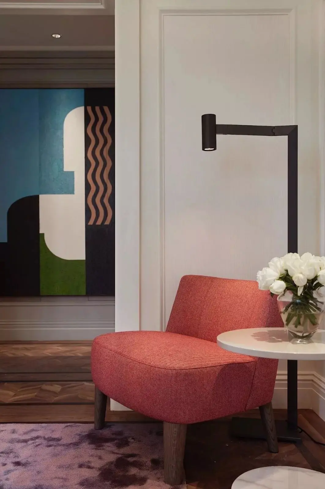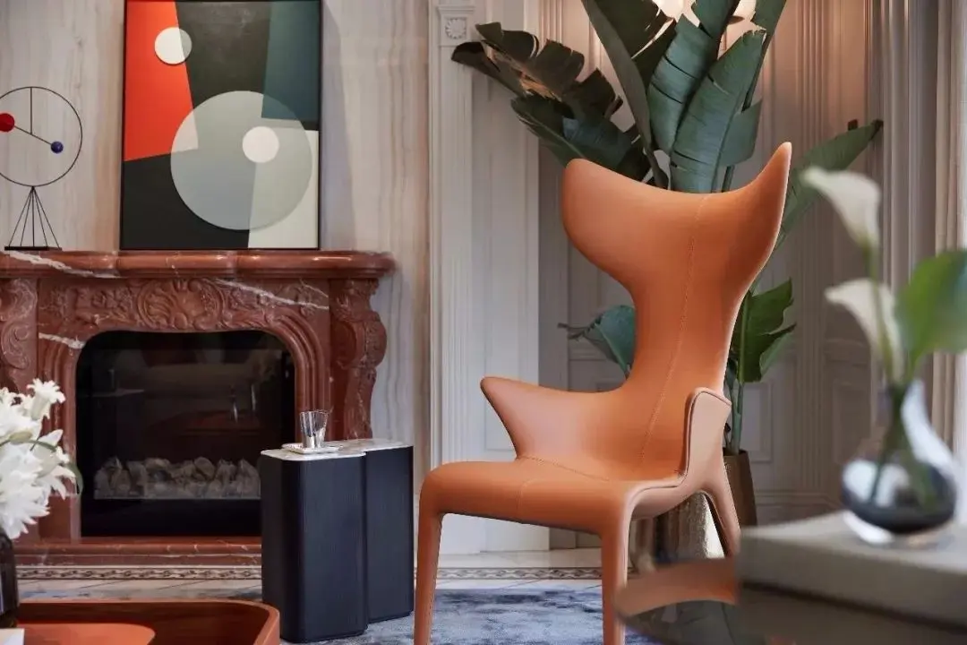 ▲爱马仕橙Poltrona Frau茶几与戏剧性般独特造型的靠椅点缀其中,同古木传统的咖啡色壁炉似离而合,渲染文艺复兴派摩登艺术,由点及面地提亮整体空间,都市时尚品味跃然于现。