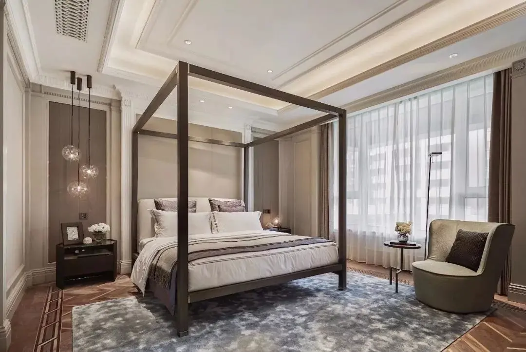 飘逸的轻纱白帘,柔软的手工编织真丝毯,增添空间温馨感;大气的衣帽间,嵌入式妆台和定制储物格轻松应对一切美妆需求,体现出居者的时尚造诣,亦油然而生对品质生活的仰慕与敬意。