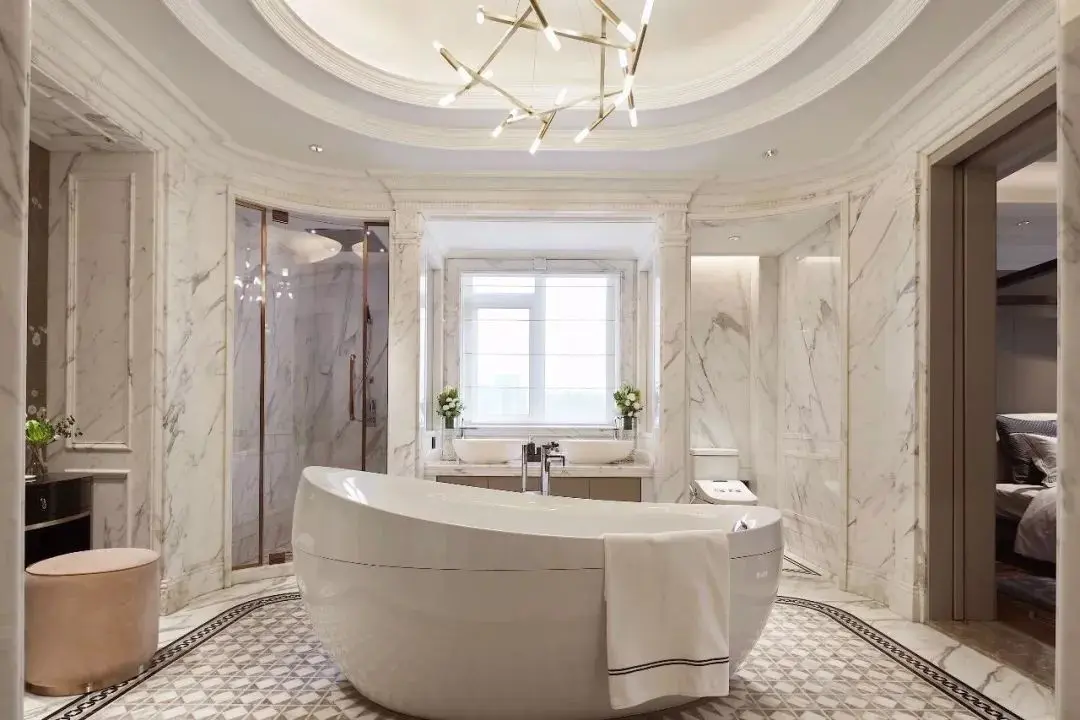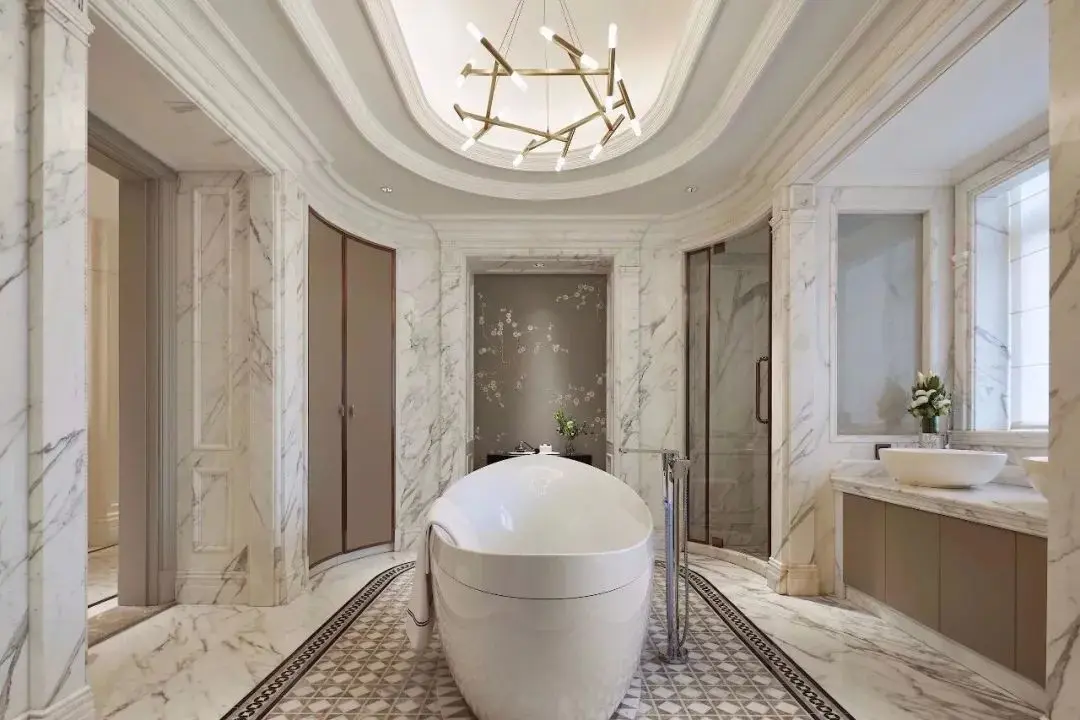 褪去繁复,奢华亦能与日常融合。Art Deco元素被安放于浴室各个角落,富有西方韵味的冷咖色大理石无形之间酝酿现代感的纯粹气质,素雅恬净给私人空间以无限遐想,同时用阵列、对称的营造空间的仪式感。