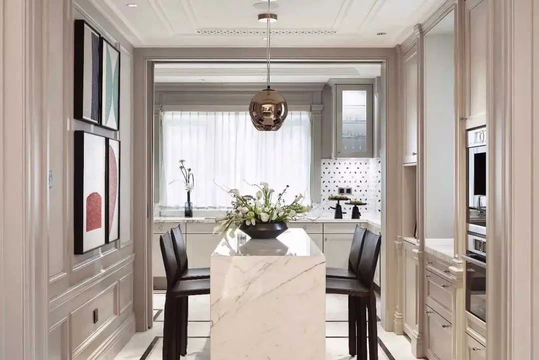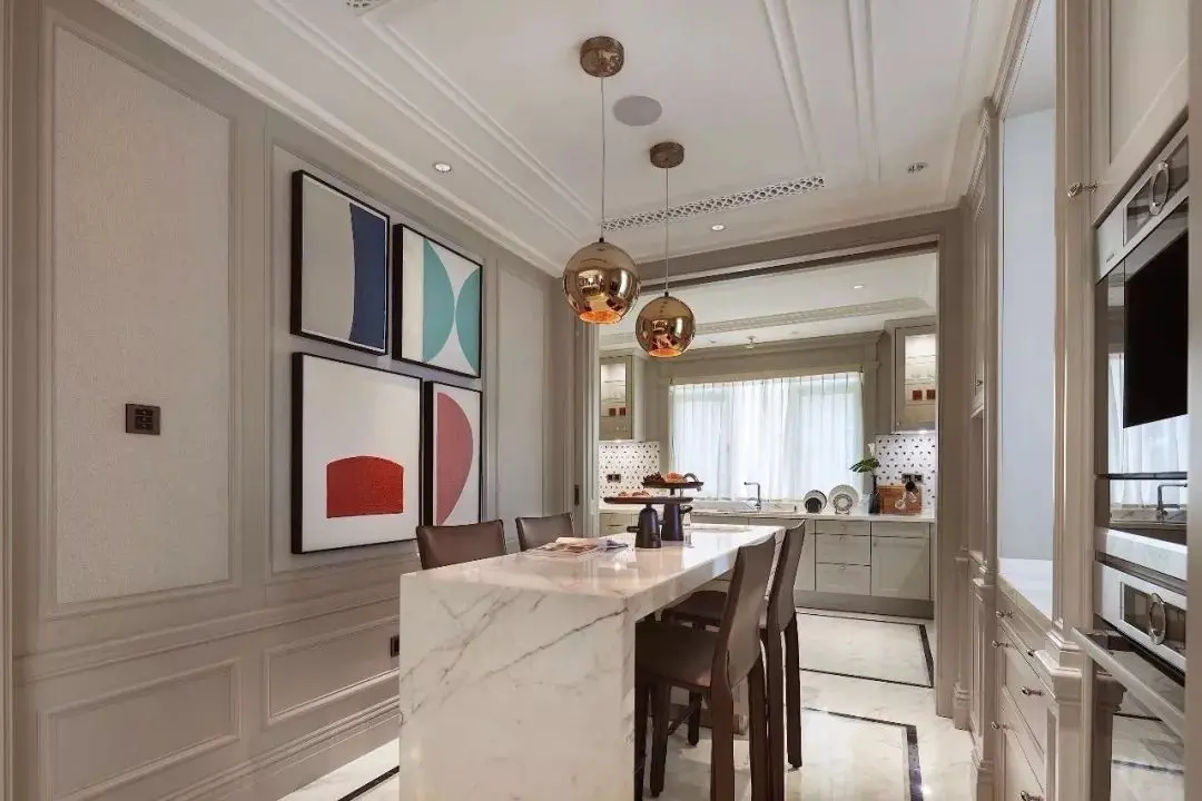 我们来自山川湖海,却囿于昼夜、厨房与爱。厨房的设计没有一丝多余的杂意,仅简练地用纯白去诠释包容性与现代感。金属质吊灯在高贵之中圆润地透露着温柔;沉稳的深蓝,纯净的淡青,时尚的赤红,鲜嫩的烟粉,四色壁画装饰像在悄悄隐喻不同性格的家人,都将家的暖意悄悄融入场景之中。
