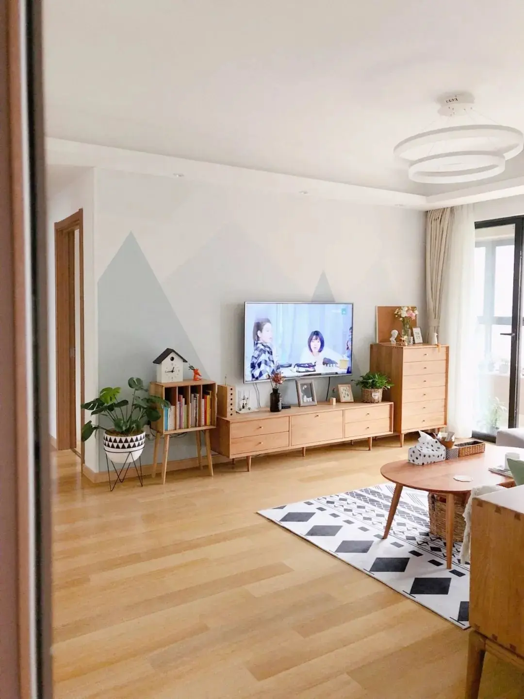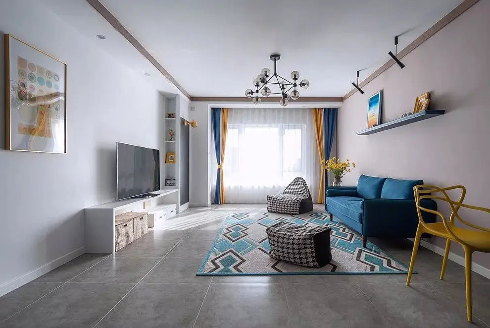 或者是把踢脚线作为地面、墙面之间的分隔点,让客厅的层次感变得更强,比如灰色的地面搭配白色的踢脚线和其他颜色的墙面。