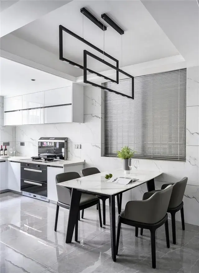 餐厅与厨房之间不做隔断,整个空间看起来更加的宽敞,而地面也同样铺贴了灰色地砖,而这些灰色地砖铺贴起来,简洁、大方又时尚!真的是很不错的~