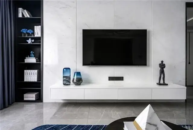 白色瓷砖电视背景墙简单大方又易于打理,而下方的吊柜与地面有着一定的间隔,这样也是便于入住之后的卫生清洁;而边上的黑色展示收纳柜,与白色形成一个很鲜明的视觉冲击,一个有层次的搭配~