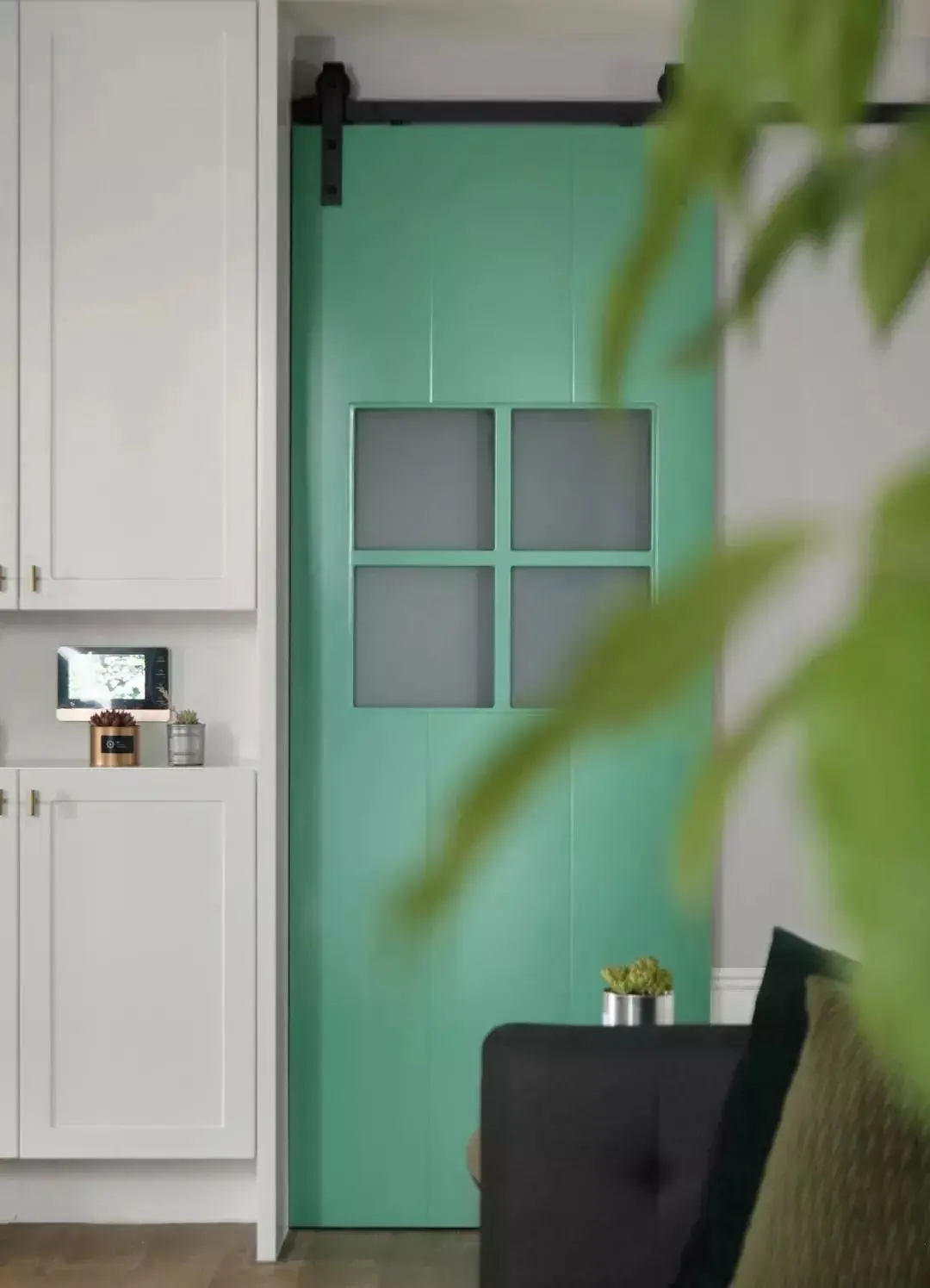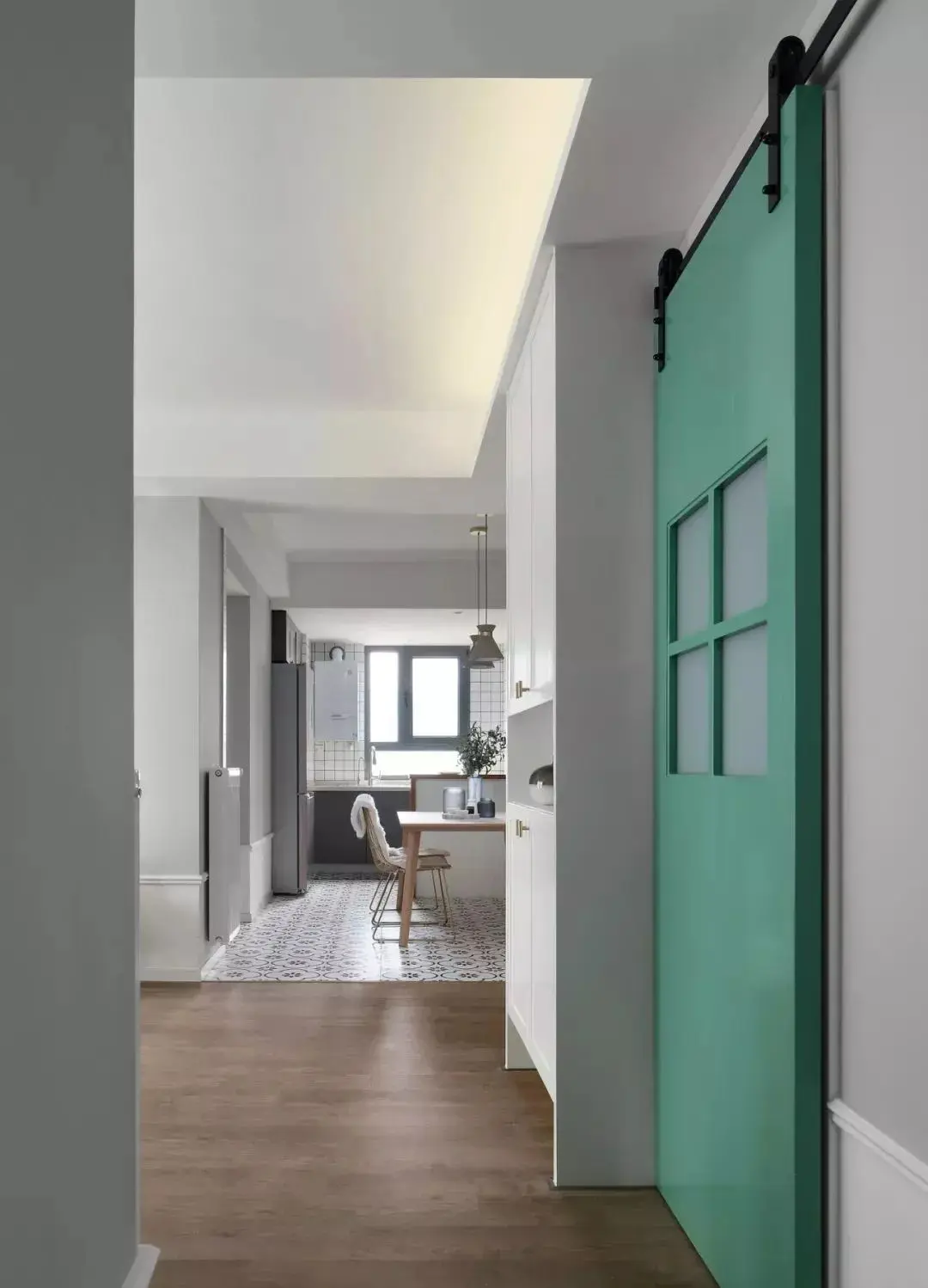 这套房子入户无玄关,为满足入户的收纳需求,在进门左侧打造了一个通顶的鞋柜,白色的柜体与旁边的绿色谷仓门相得益彰。