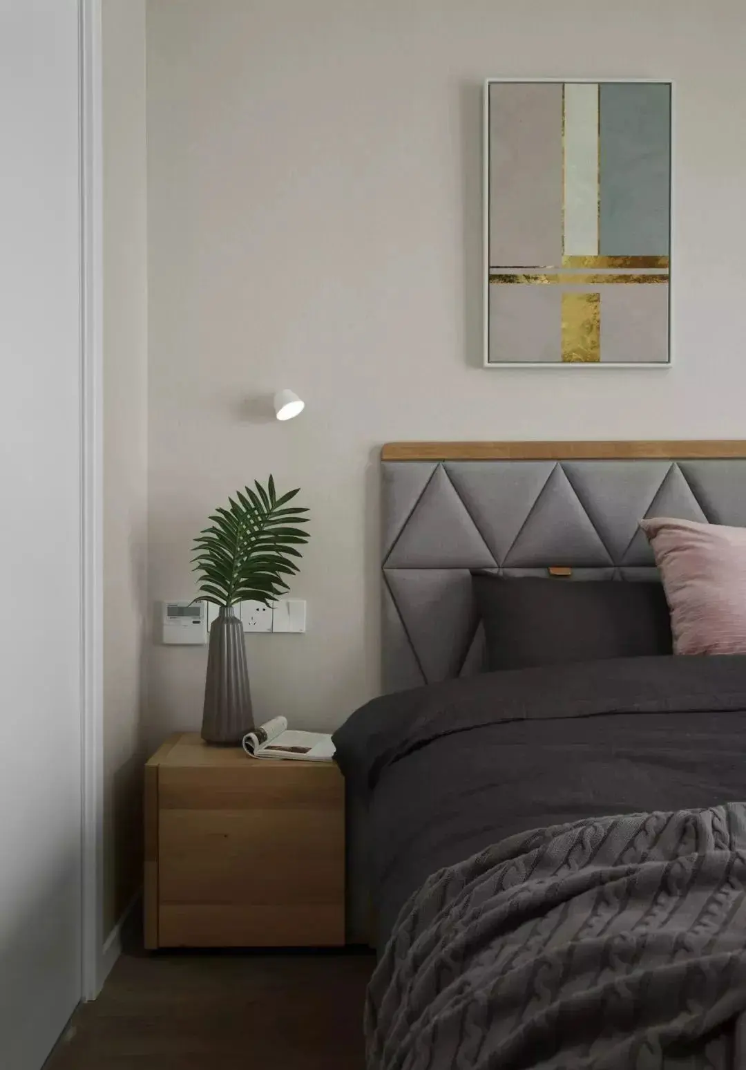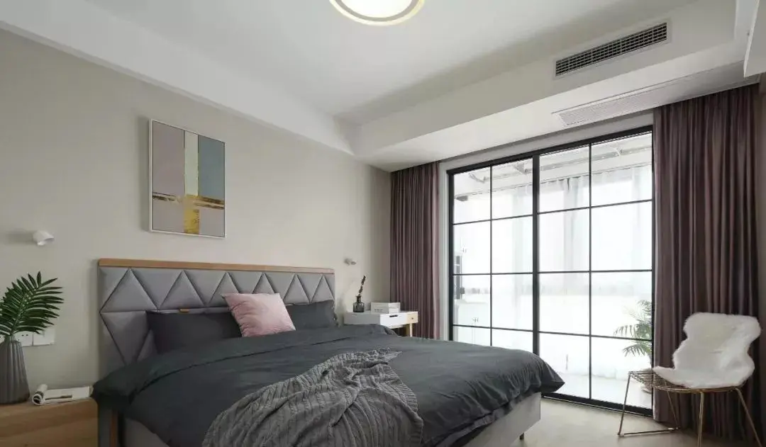 主卧以柔和的灰粉调子营造温馨舒适的睡眠环境。主卧外有个大阳台,以黑框来玻璃移门相隔,每天拉开窗帘,阳光和煦,还有清新养眼的绿植,从美好中开始一天的生活。