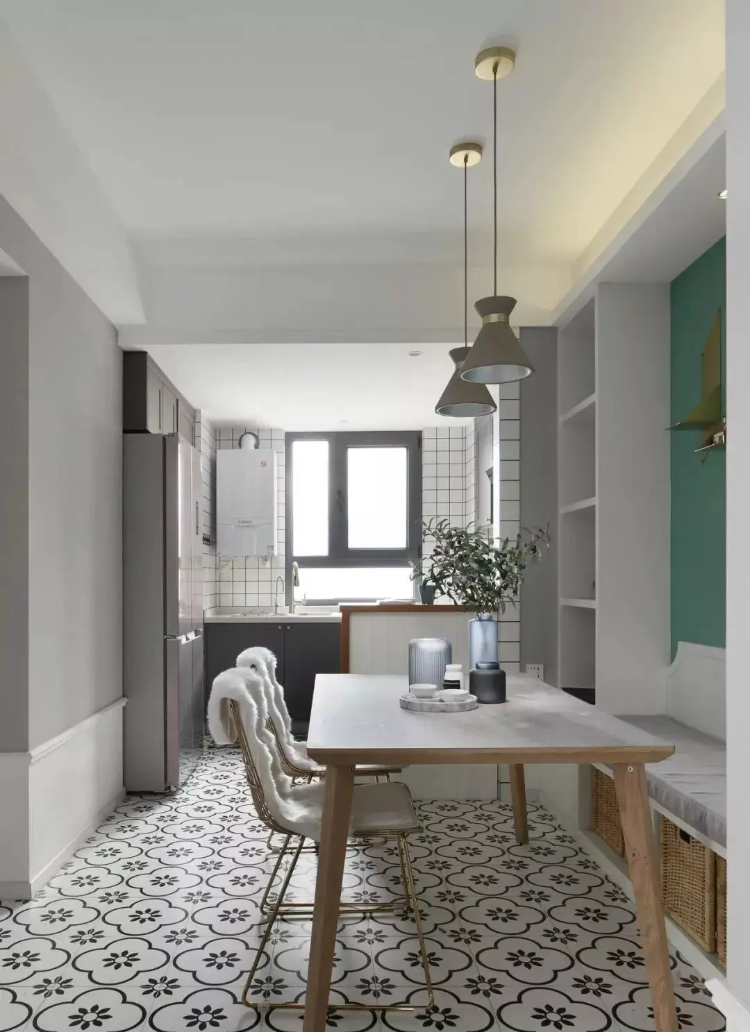 餐厅、厨房区域以花砖进行铺贴,在这片以纯色为主的空间中,结合造型简洁的木质餐桌搭配金属餐椅,让空间更具变化性及层次感。