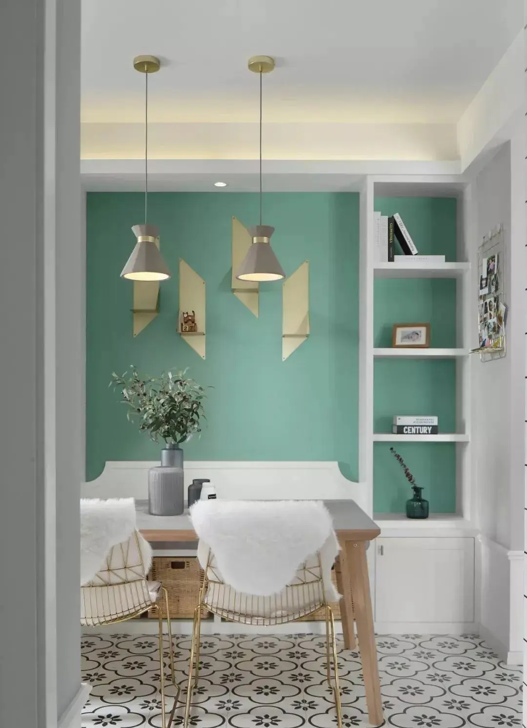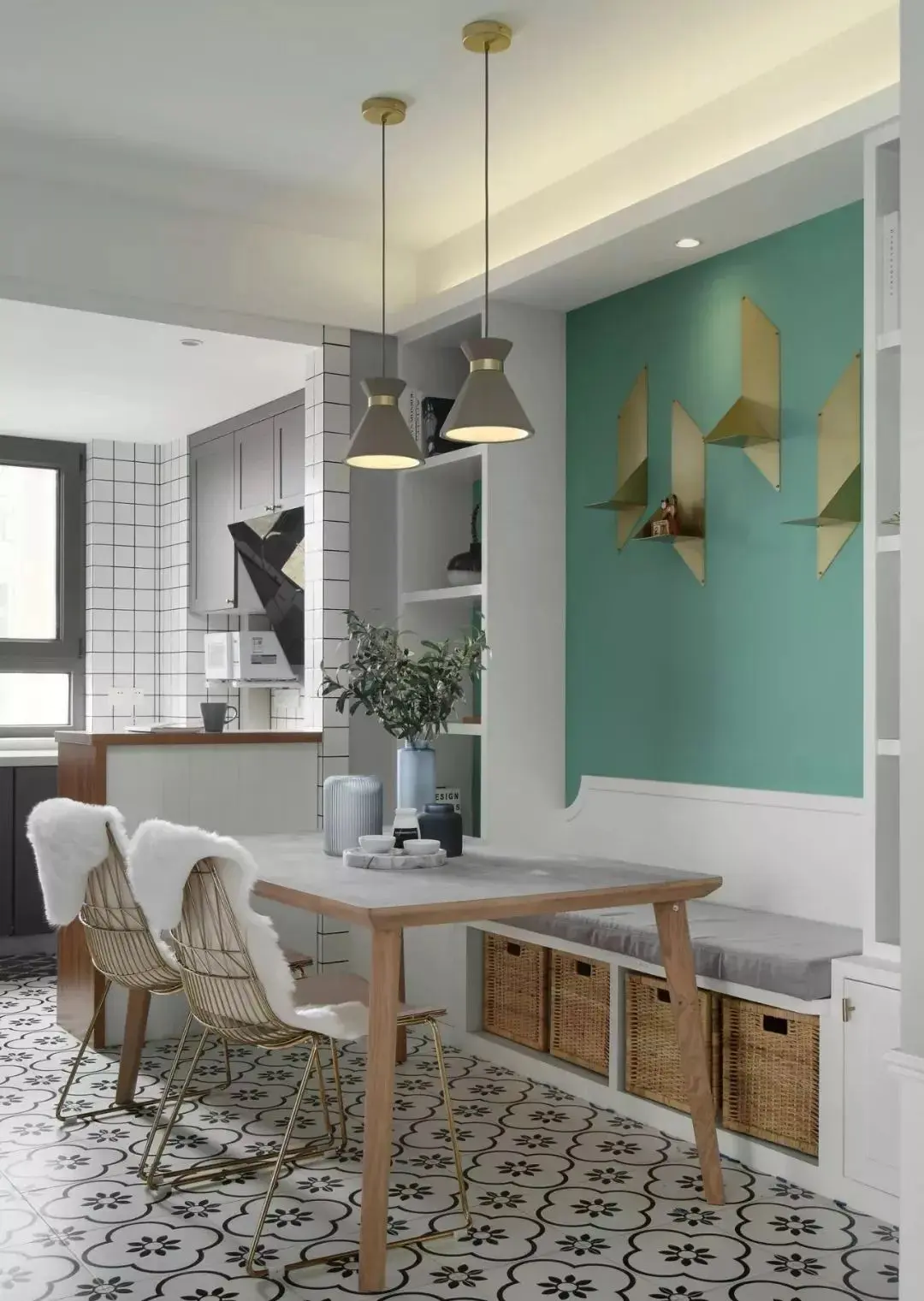 卡座餐厅,既美观又满足储物的需求。背景墙仍选择业主喜欢的绿色,在白色定制卡座的映衬下,让这片区域显得更加清爽,带给视觉极大地舒缓。