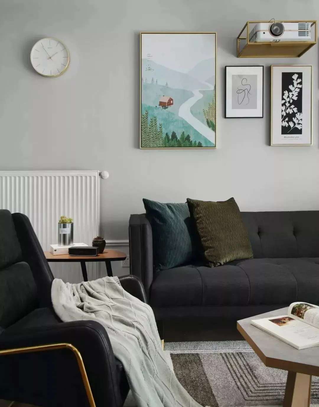 投影仪隐身在几幅装饰画中,一个小小的隔板就是它的容身之所,对面的电视墙大量留白,简洁大方,也方便投影,在家就能享受电影院的观影体验。
