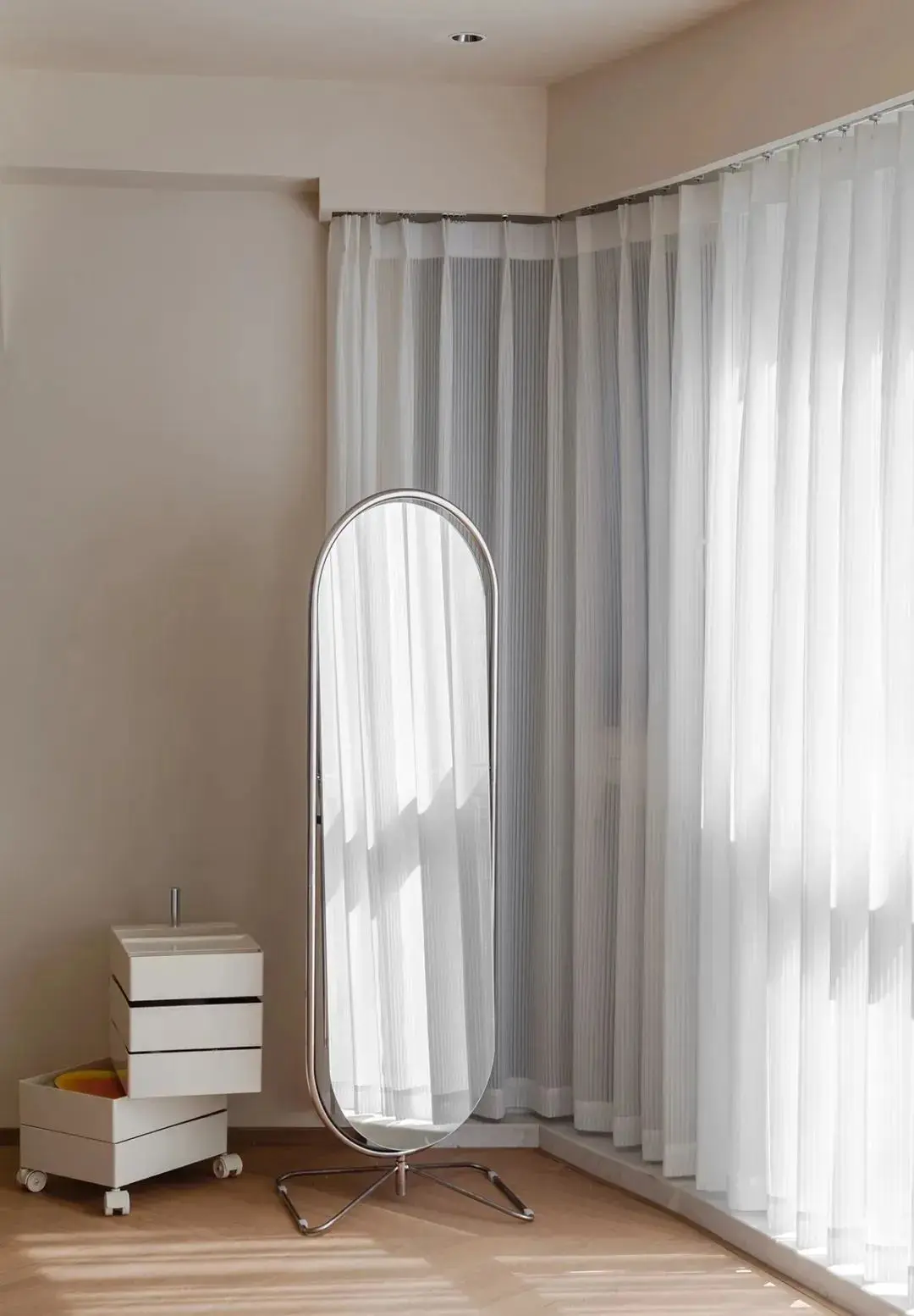 L型的独立定制衣帽间,是女主人的专属空间。利用飘窗设计了储物格,阳光很好的午后,手捧一本书籍,坐在飘窗上,享受着宁静的独处时光。