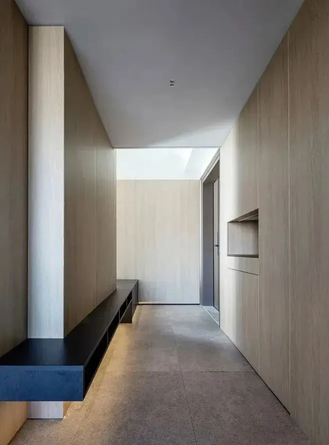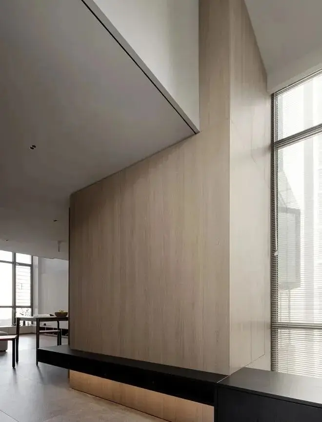 改造之前,这个小家的入户没有收纳,直接放柜子又显得太过突兀。改造之后,玄关两边分别做了收纳柜。悬空柜体兼备收纳与换鞋功能,木饰面和黑色的结合,给人沉静自然的感觉。通过加宽原有窗台,客厅空间得以扩大,电视柜、窗台、沙发共同形成三面围合的核心区域,一家人可以在这里看看电视、喝喝茶。
