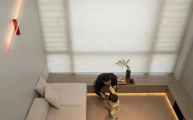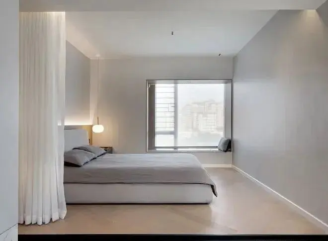 由于房间不大,所以设计师特地选择了重心较低的床,让整个卧室保持开阔。为了营造舒适慵懒的睡眠氛围,安装电动纱帘,卧室的光线更加柔和,非常适合睡觉。